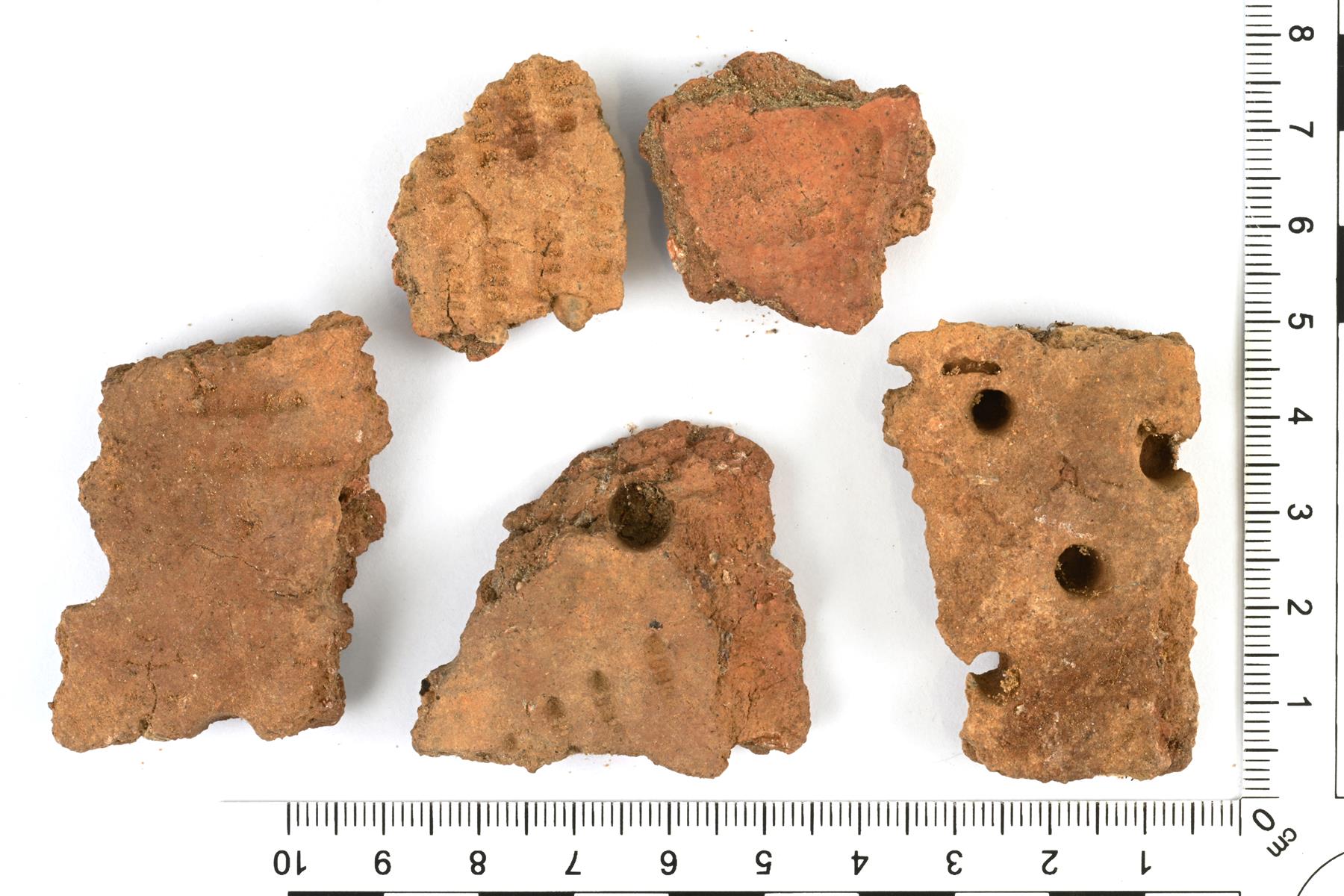 | Laatikosta 2. Kampakeraamisten astioiden kylkipaloja. Osassa on koristeluna kuoppia ja kampaleimakuviota. Väritys vaihtelee ruskeasta punaruskeaan. Poltto on melko hyvä. Sekoitteena melko hienoa kivimurskaa (1-2 mm). | |