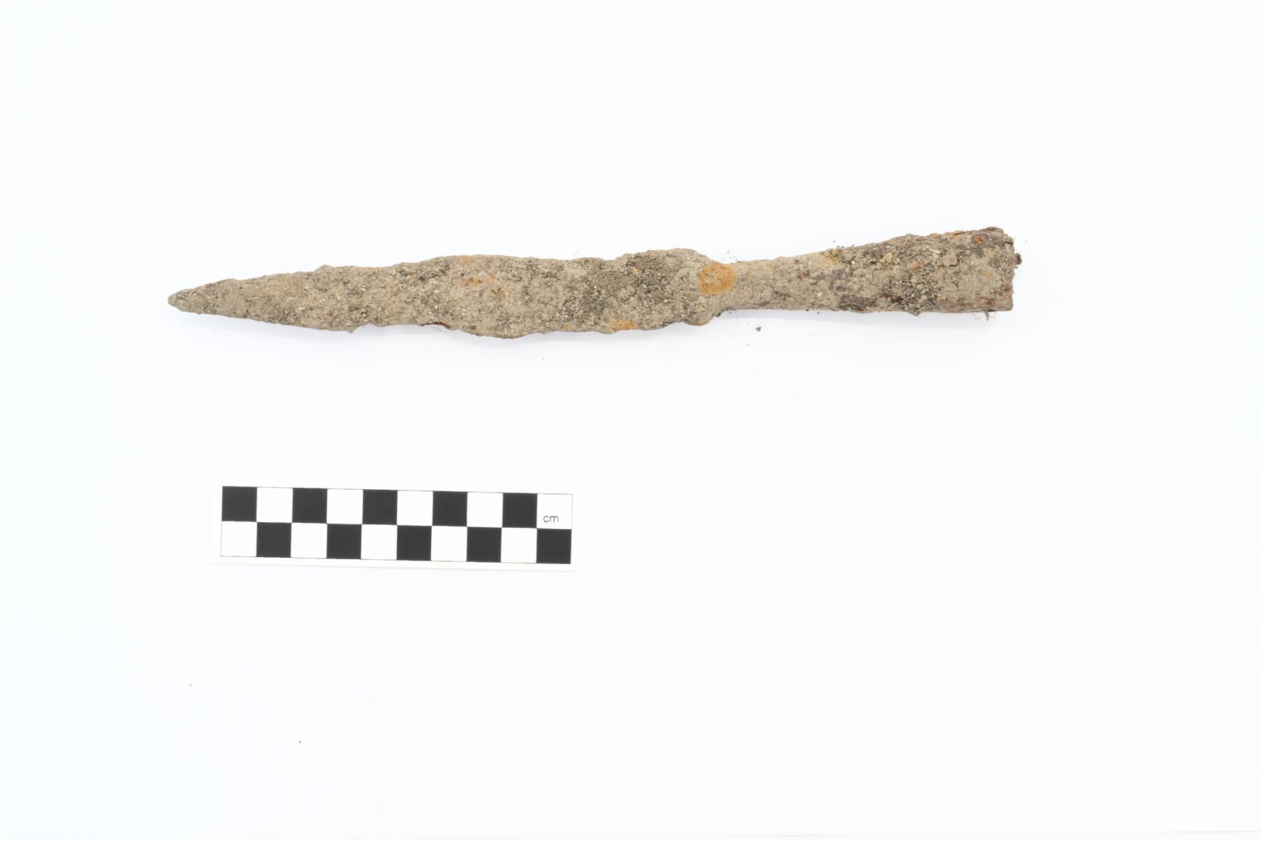 | Varsiputkellinen keihäänkärki. Muodoltaan itäbalttilaista tyyppiä, joskin melko pieni (vrt. Kivikoski 1951, Abb. 1106, Nallinmaa-Luoto 1978, s. 136-137, Taulu V:2-3, Taulu VII:2-3, 5, 7). Kapealehtinen, lehden kannat viistot, lehden poikkileikkaus matalan rombimainen. Putken suuaukon lähellä naulanreikä. Lehden reunat rikkonaiset. Teräosa taipunut kaarelle. | |