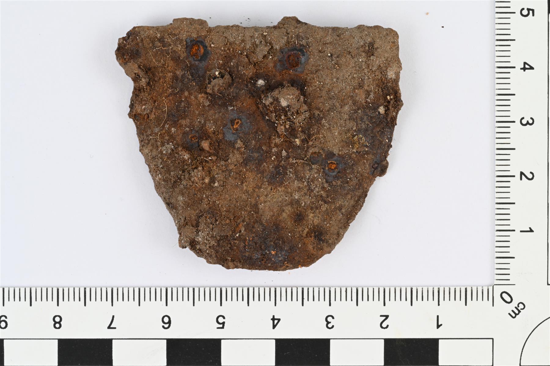 | Kaareva rautalevyn katkelma, mahdollisesti padan reunapala. | |
