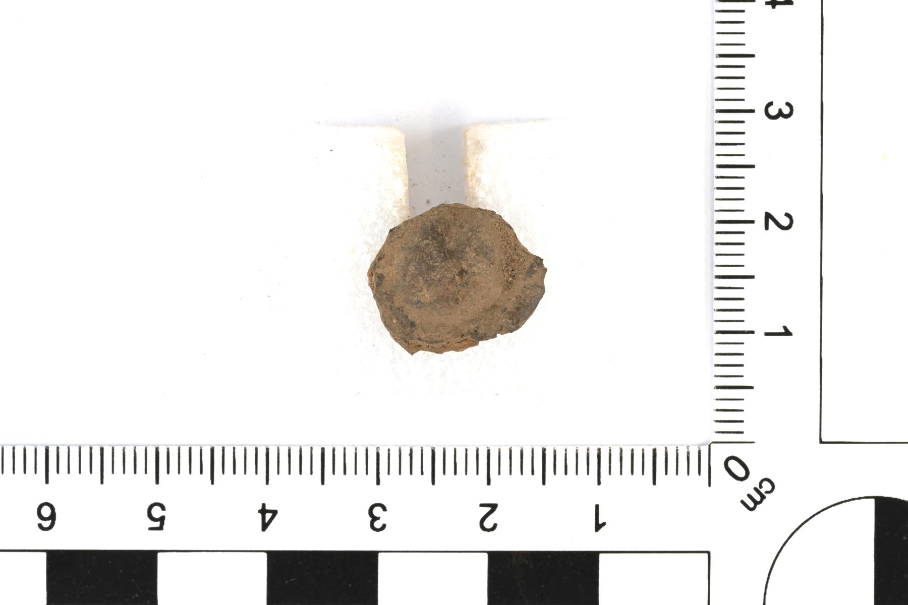 Pyöreän helan katkelma. Reunat ovat murentuneet. Taustapuolella on taipunut niitti. | |