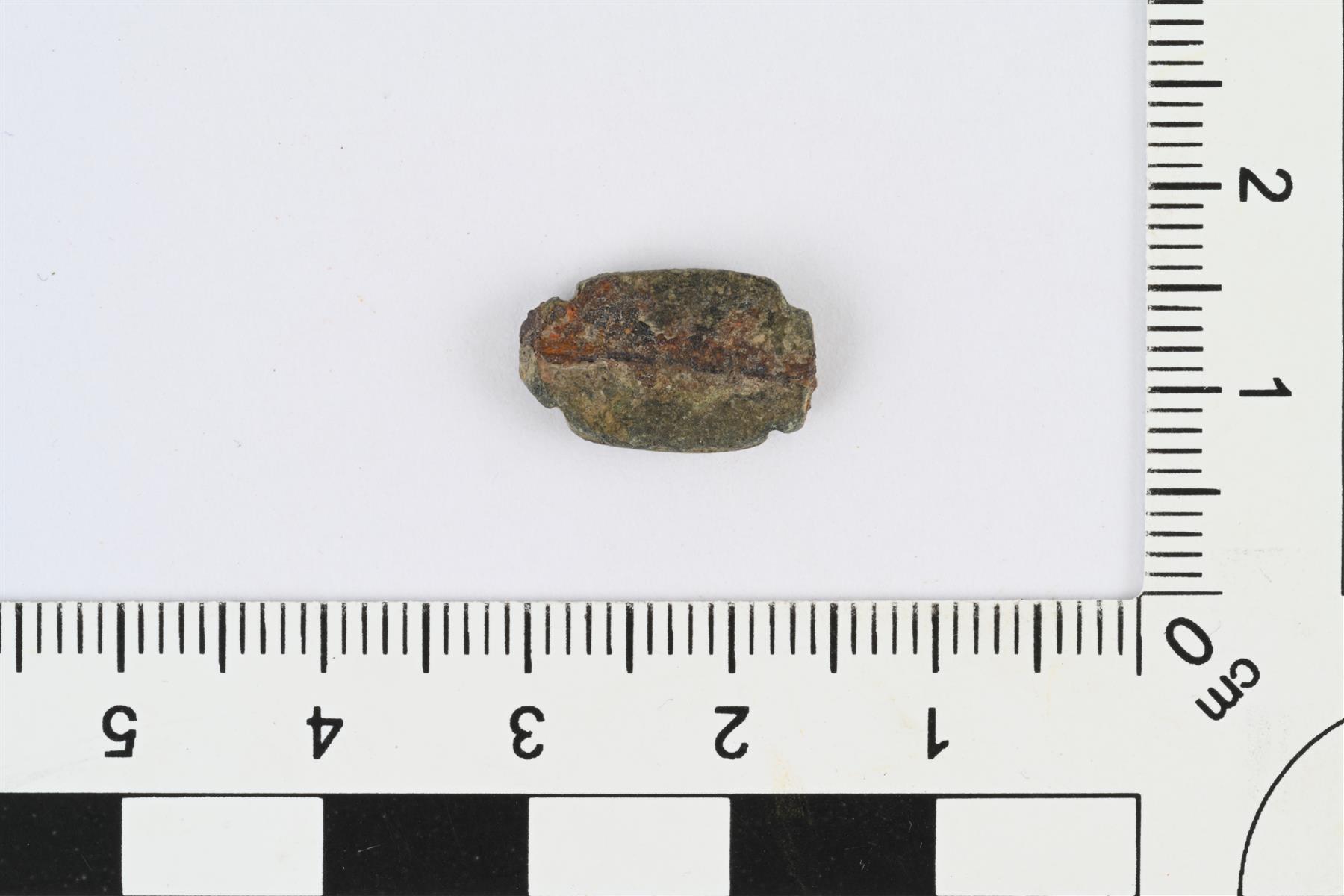 | Pöytäveitsen päätehela. Litteä ja soikeahko, päät muotoiltu portaittain kapenevaksi. Porrastuksen kohdalle tehty etupuolelle pienet viistot uurteet. Taustapuolella keskellä pitkittäinen ura, jossa jäljellä hieman rautaa veitsen kahvaruodosta. | |