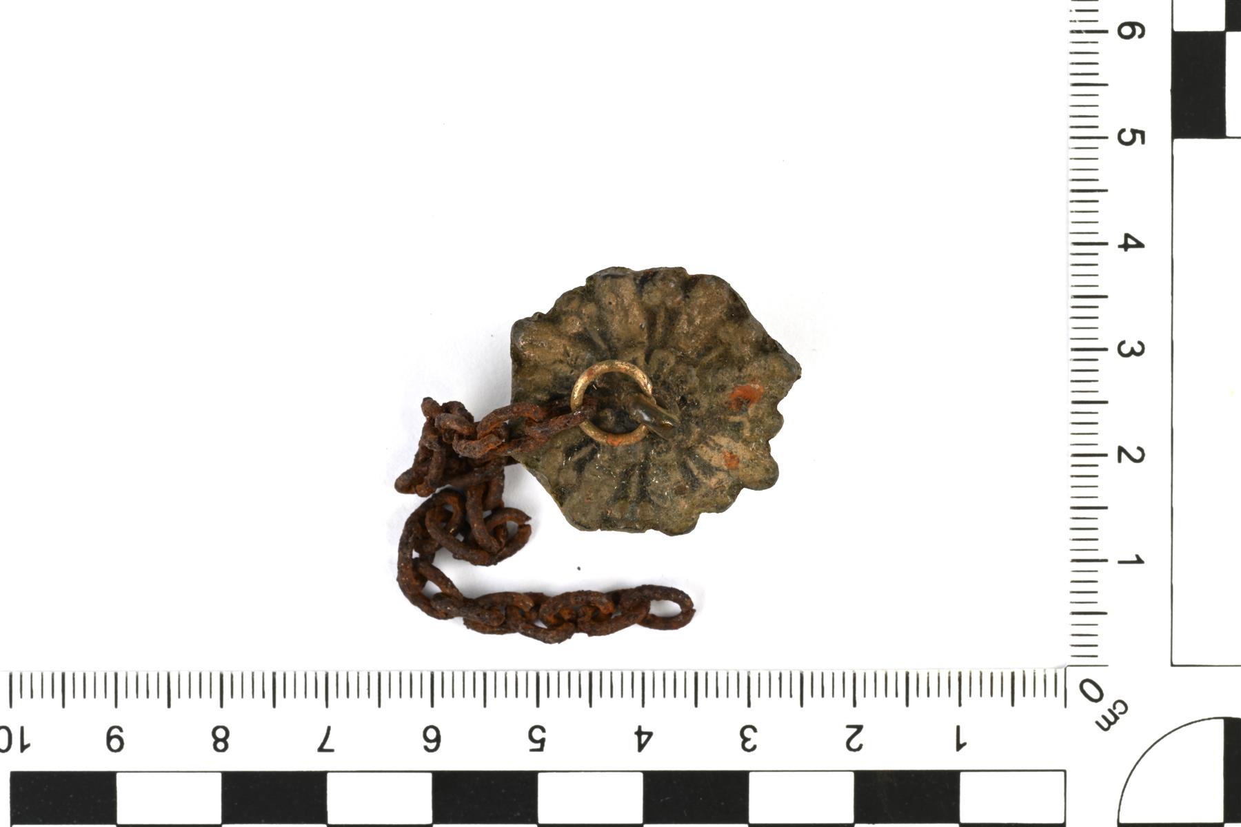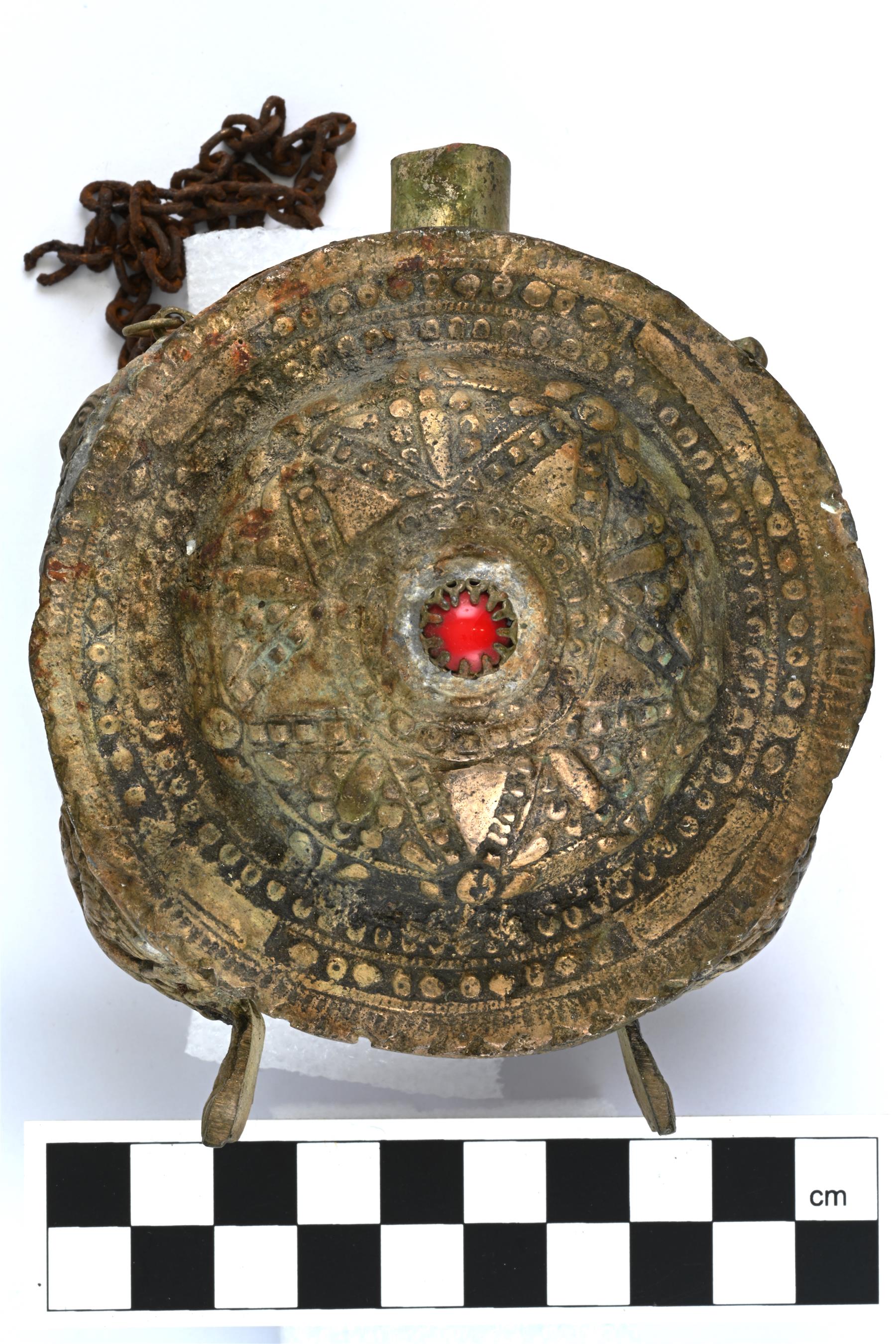 | Profiililtaan pyöreä pyhiinvaelluspullo. Etu- ja takapuoli levenevät ulospäin puolipallomaiseen muotoon.