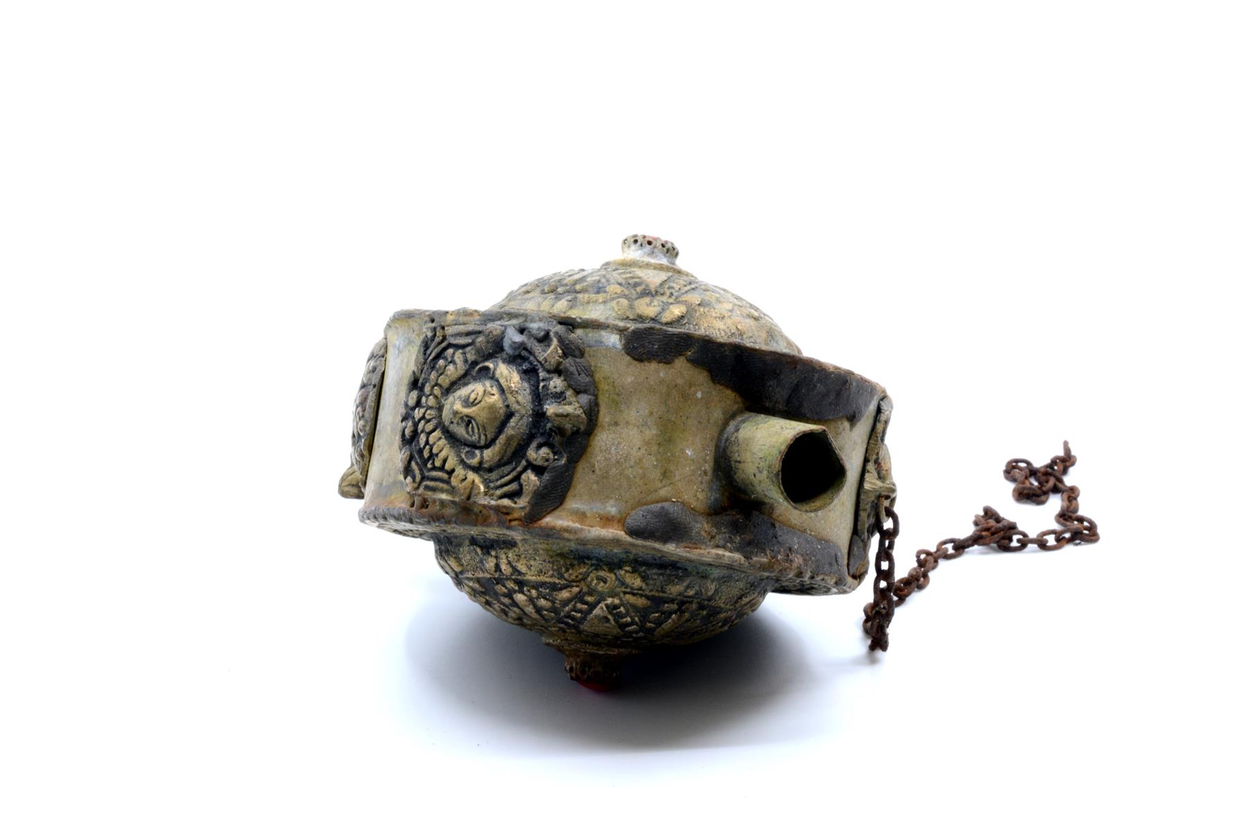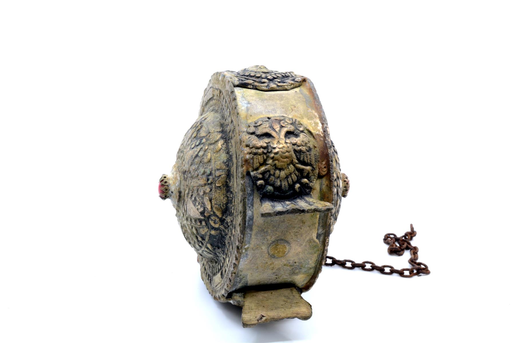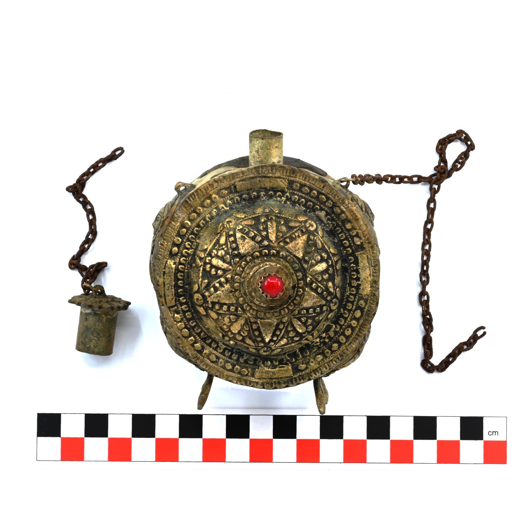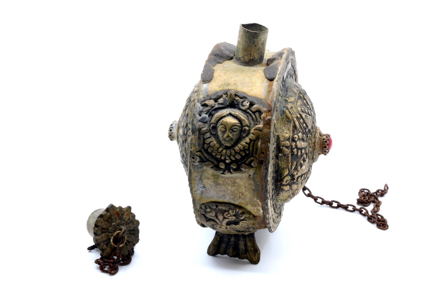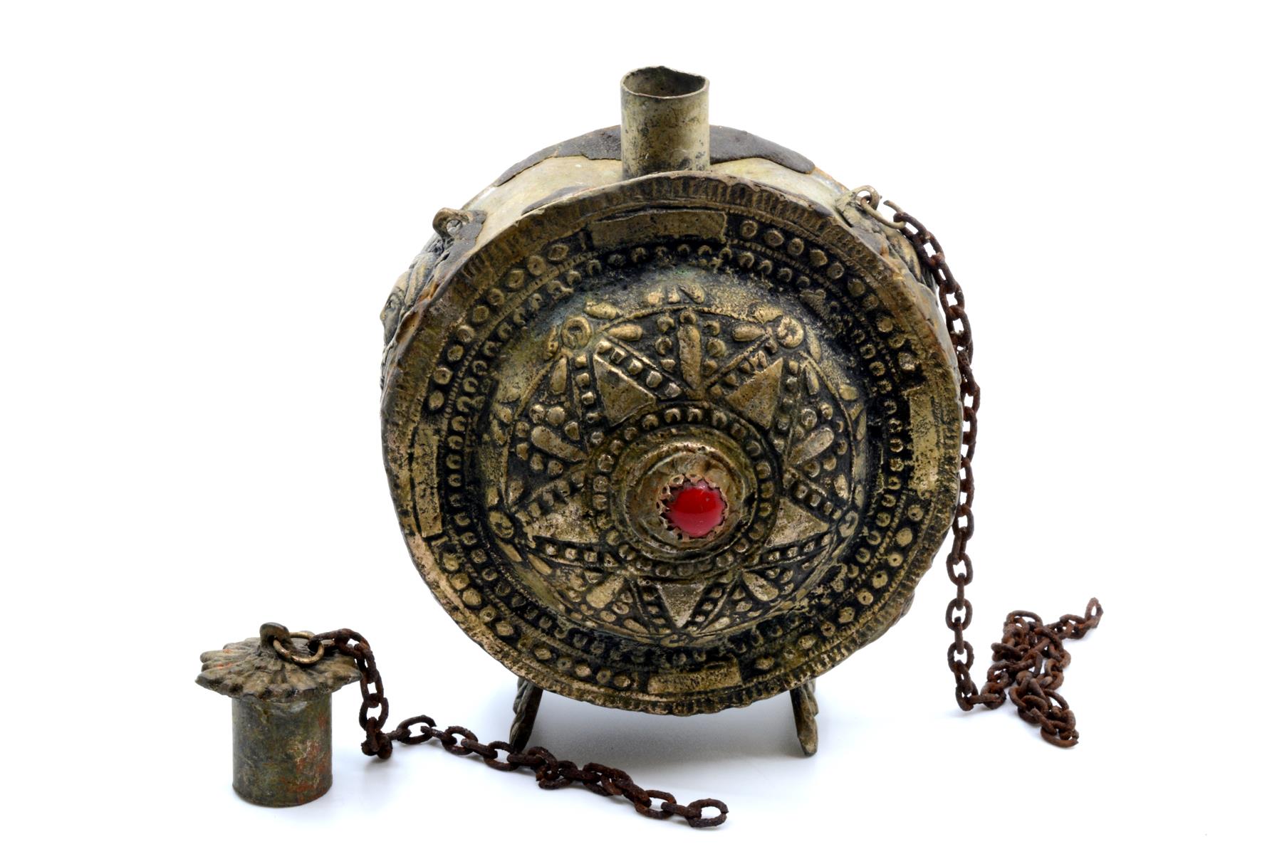 Etu- ja takapinta on koristeltu pakotetuilla ornamenttikuvioilla. Keskelle on istutettu punainen kivi tai lasihelmi. Kiveä ympäröi kolmio-, piste- ja viivakuviointi, joka muodostaa aurinkomaisen symbolin. Reunoja kiertää pisteistä muodostuvat viivat. Sivuilla on koristelevyinä kaksipäinen kotka ja kerubin kasvot. Kotkien koristelevyt muodostavat myös pullon jalat. Pullon korkki on erillinen ja rautainen kiinnitysketju on katkennut. Astia on koottu useasta osasta juottamalla. Yläreunassa on hartsimaista massaa, jolla juotossaumoja on todennäköisesti yritetty myöhemmin tiivistää. Hartsista voi erottaa sormenjälkiä. Ortodoksiselta kirkkomuseolta saatujen tietojen mukaan esine on valmistettu Kreikassa tai Vähä-Aasiassa. |