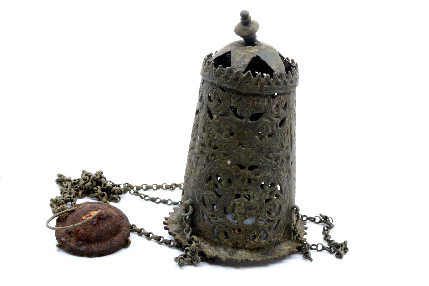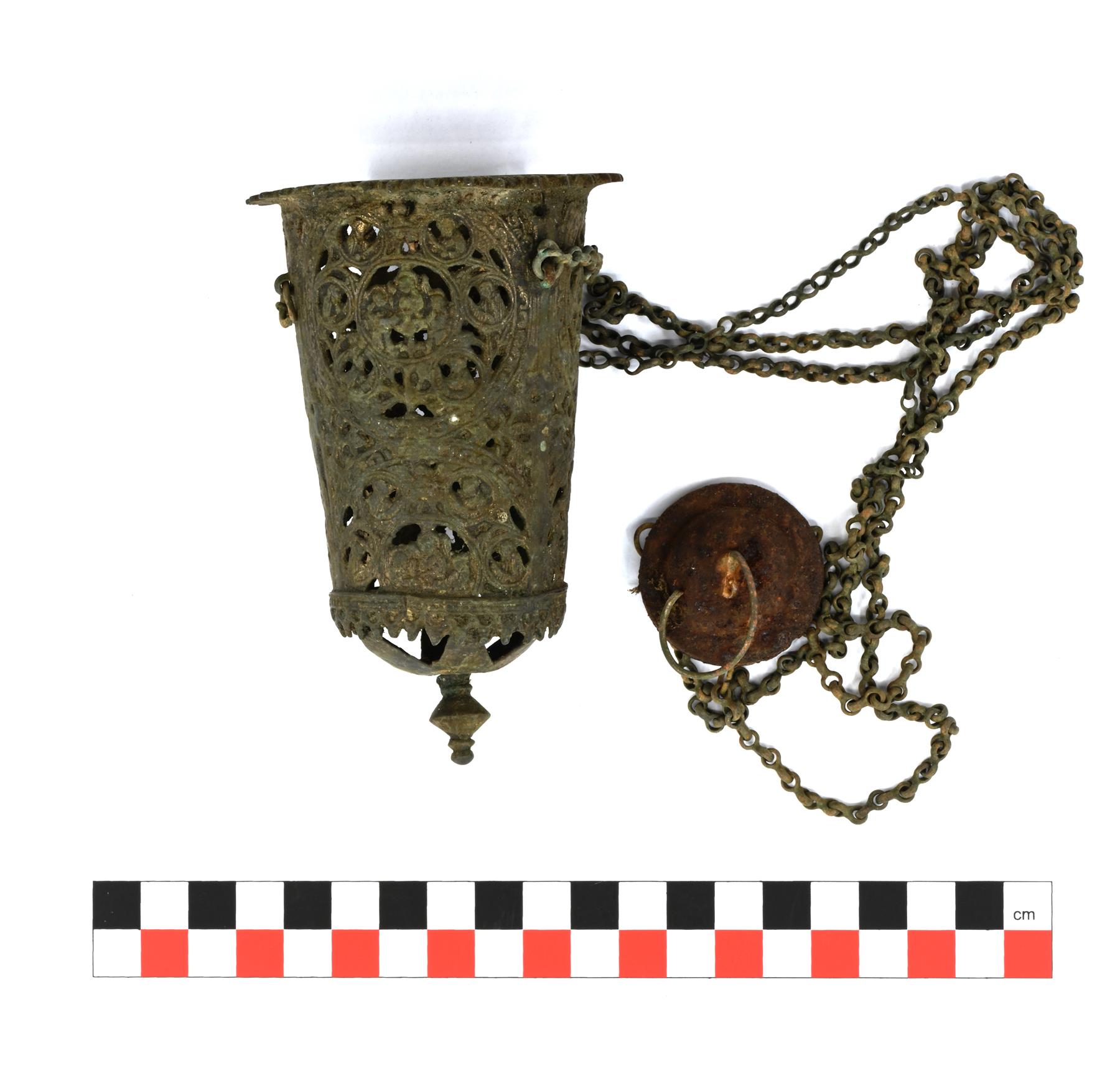 Koristeltu puhkonaisin kuvioin, jotka muodostavat pyöreitä ornamenttikenttiä. Näissä on kuvattuna yksinkertaistettuja ihmishahmoja, jotka toistuvat jokaisessa kentässä. Sivuille on kiinnitetty kolme kupariseosketjua, jotka liittyvät rautaiseen ja muodoltaan kuppimaiseen levyyn. Ortodoksiselta kirkkomuseolta saatujen tietojen mukaan esine on valmistettu Kreikassa tai Vähä-Aasiassa. |
