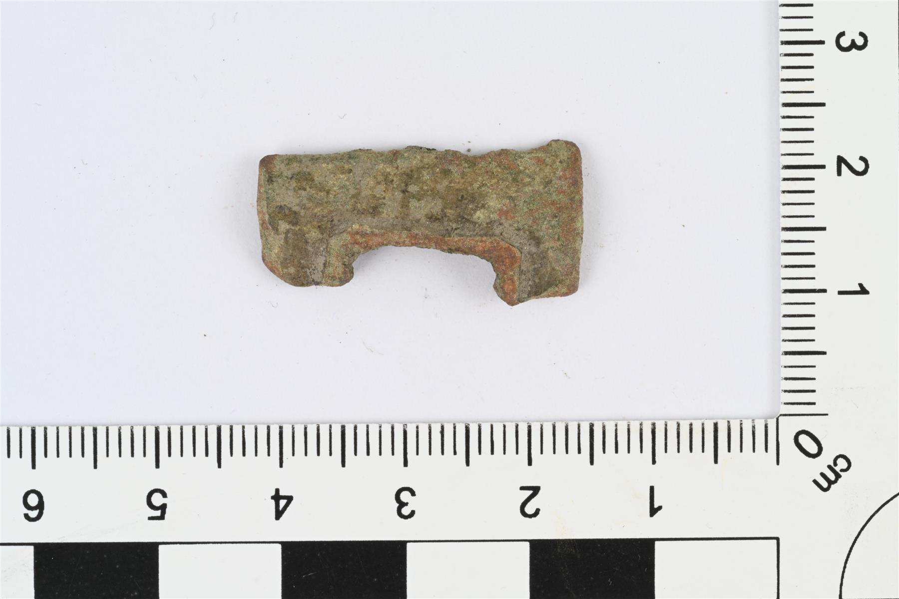 | Kupariseosesineen katkelma. Katkelma suorakulmaisesta esineestä, jossa pyöristetyn suorakulmainen reikä. Toinen pinta hieman kupera ja toinen kovera. | |