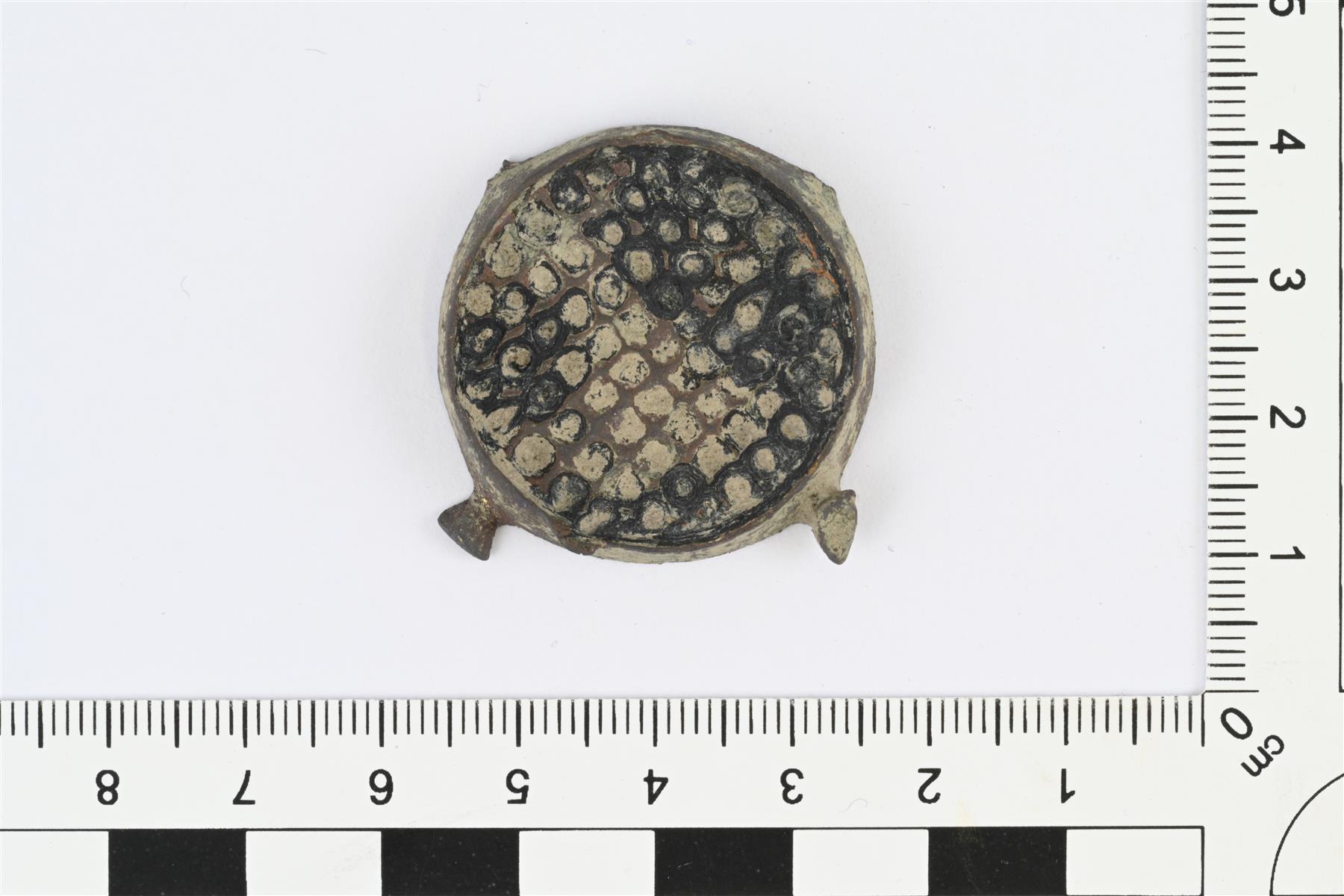 | Kupariseosesine, todennäköisesti purjekintaan eli purjeentekijän käsineen metallivahvike. Pyöreä ja litteähkö, reunoissa ollut tasaisin välein neljä tappia, joista kaksi jäljellä. Tapit lyhyitä ja voimakkaasti päähän leveneviä. Esineen etupuoli kovera ja siinä tiheästi pieniä pyöreitä kuoppia suorissa riveissä. | |