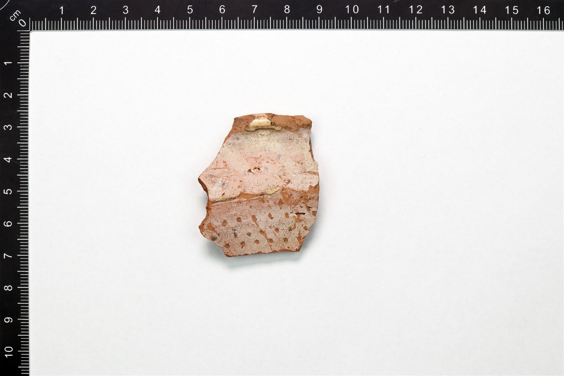 | Reunapala, jonka sisäpinnalla on hemring-koristelua, valkoista savilietettä ja jäämiä vihertävästä lyijylasitteesta. | |