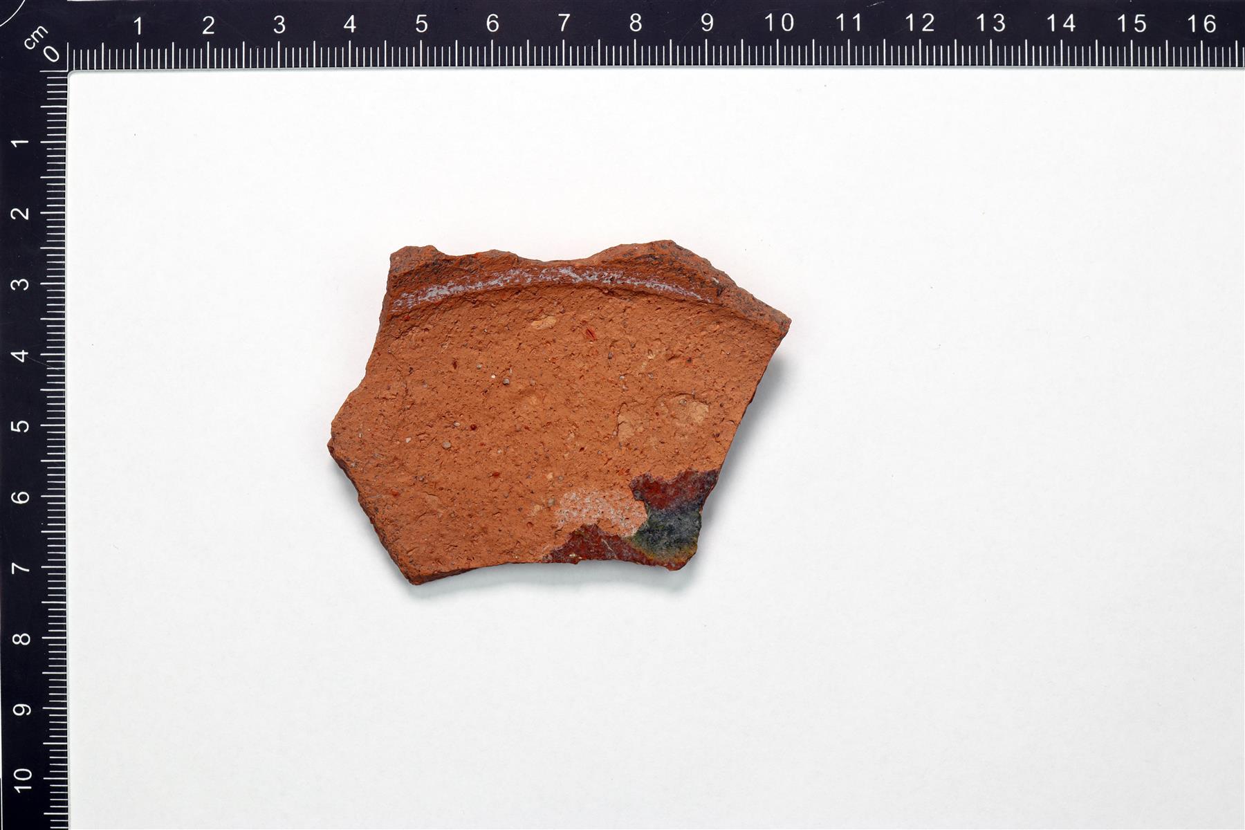 | Pohjapala, jonka sisäpinnalla on jäämiä valkoisesta savilietteestä ja vihertävästä lyijylasitteesta. | |