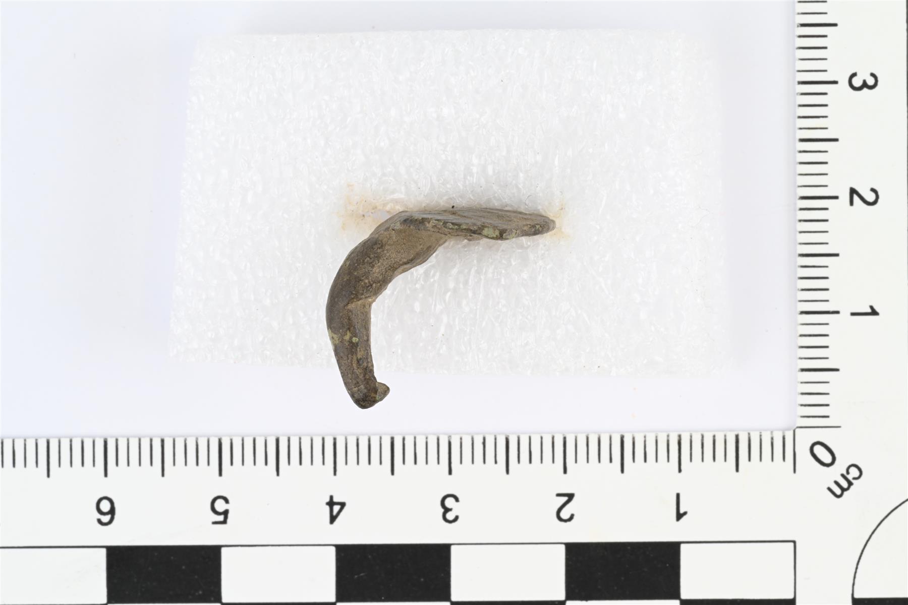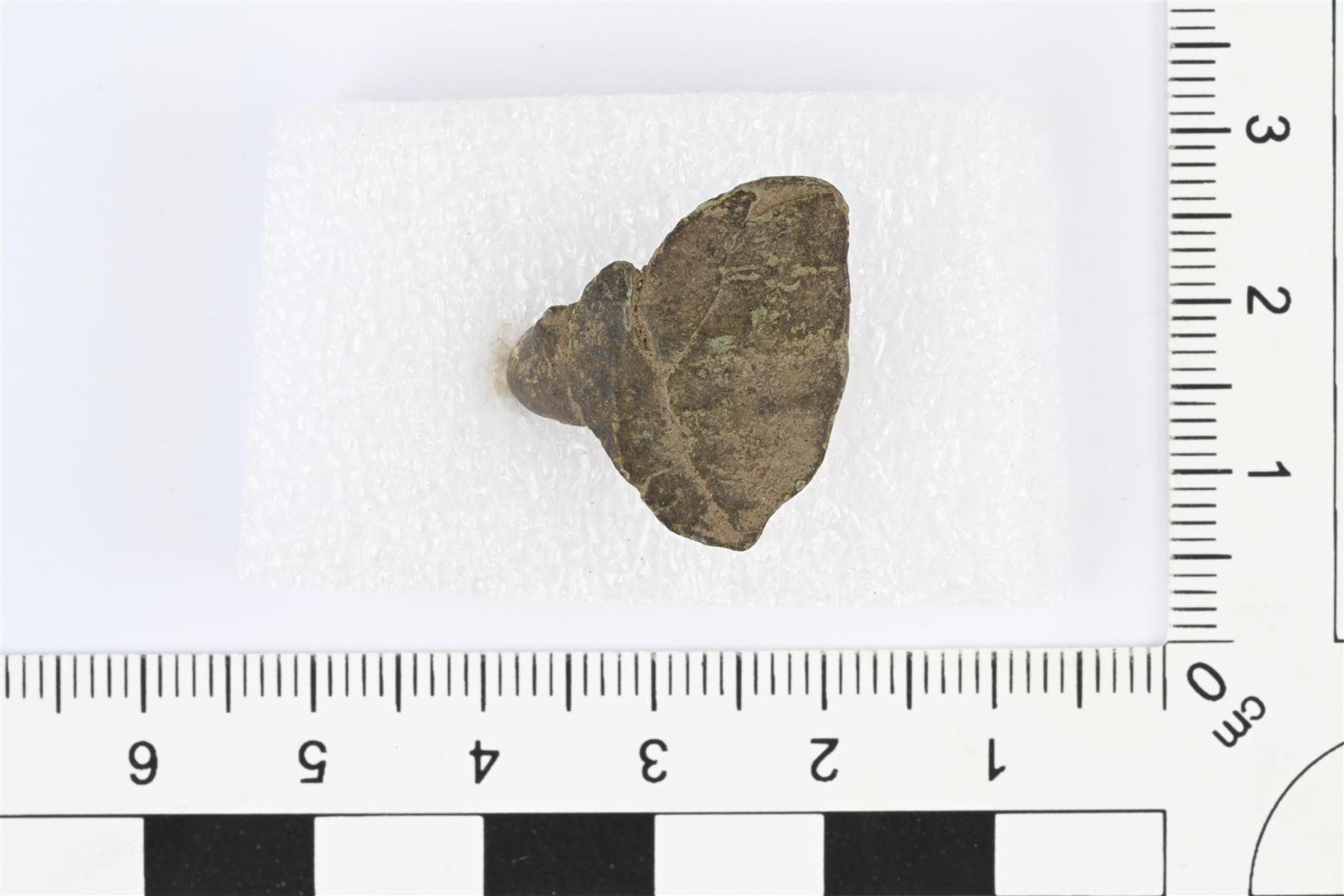 | Mahdollinen kantasormuksen katkelma. Varsinkin kehä epäsäännöllinen, mahdollisesti epäonnistunut valu tai osittain sulanut. Kanta suuri ja pyöreähkö, katkennut keskeltä. | |