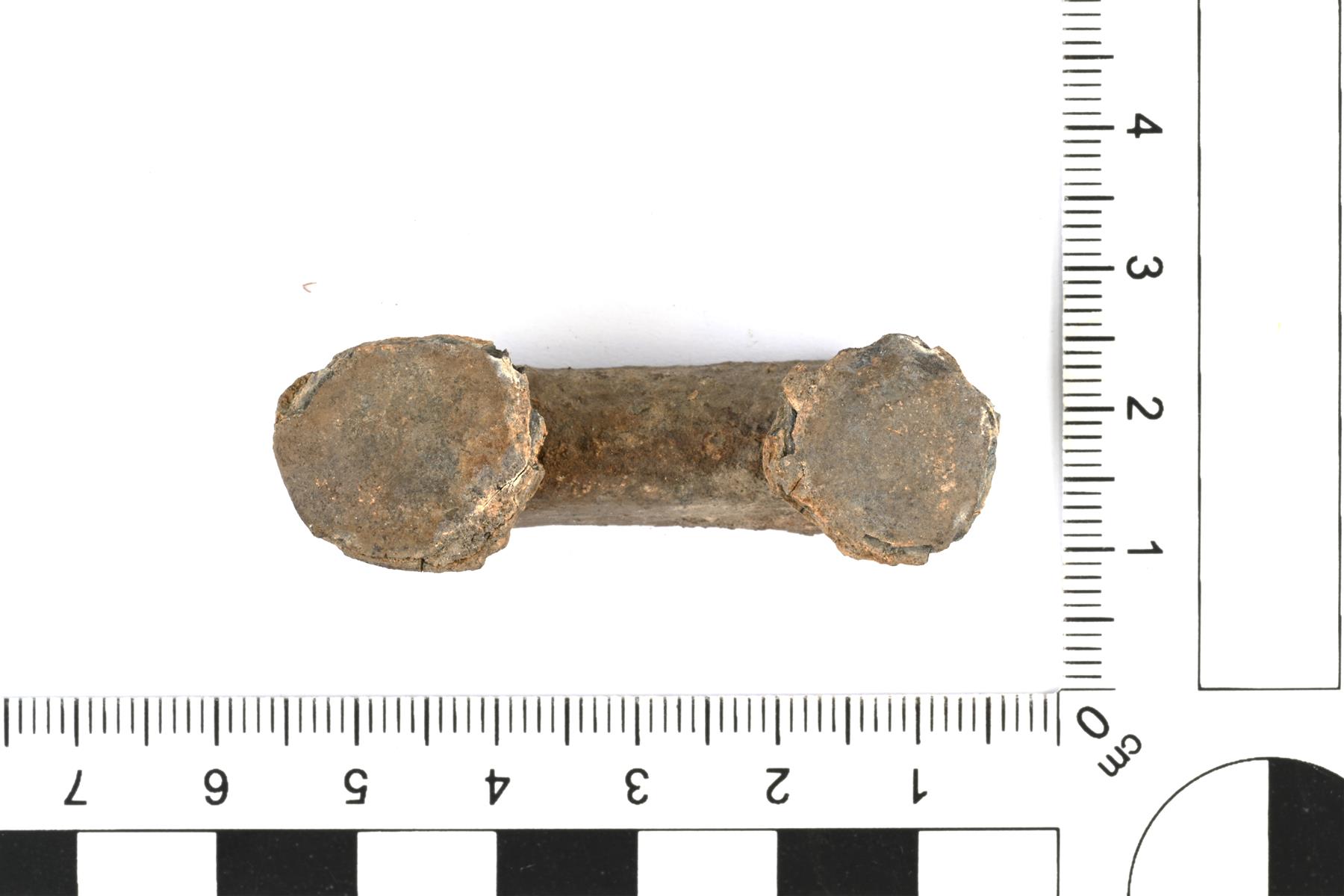 | Raskastekoinen kaksoisnappi. Nappien reunat ovat murentuneet. | |