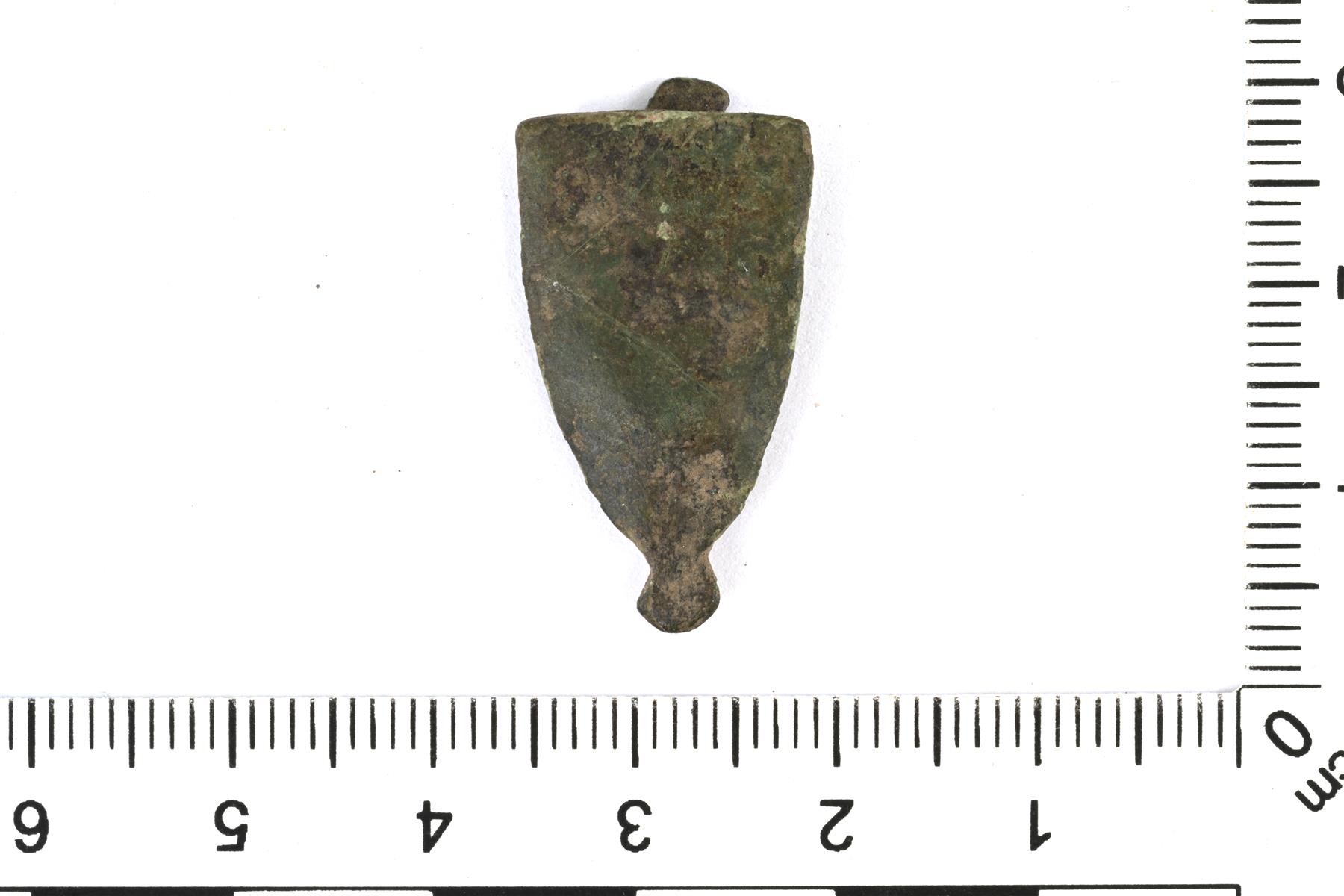 | Levymäinen hela. Kapenee toista päätä kohti, jossa on koristeena muodoltaan pyöreä nuppi. Taustapuolella on kiinnitysniittien jäänteet. | |