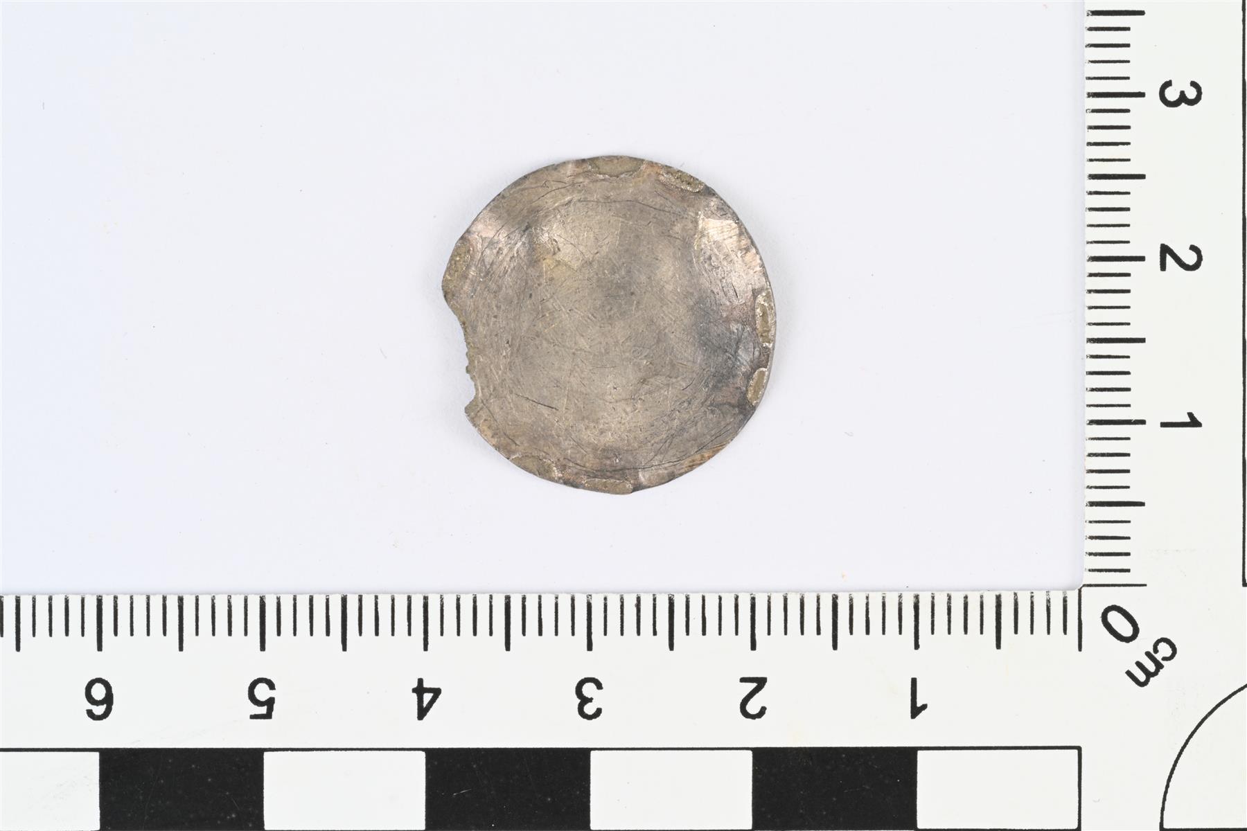 | Dirhemin aihio, jossa reiän alku. Reunasta puuttuu pieni pala. | |
