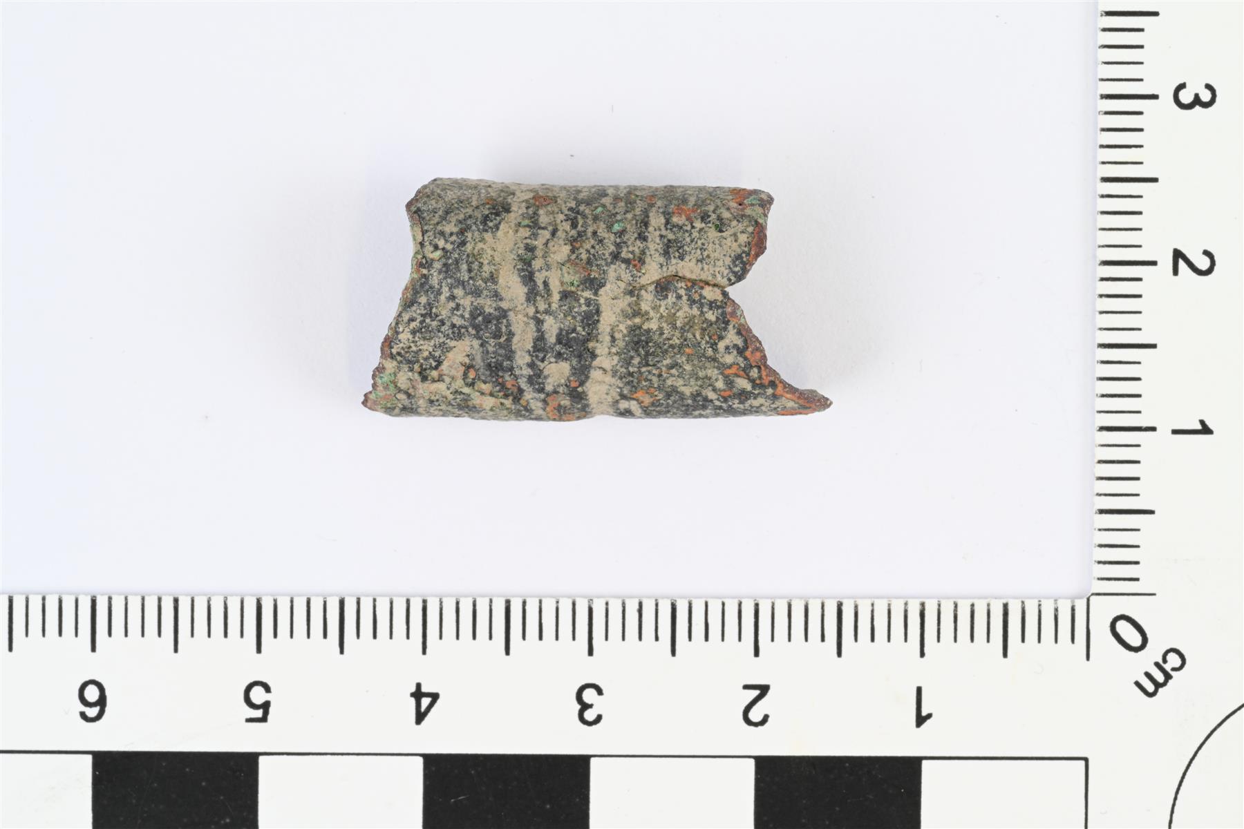 | Kupariseosesineen katkelma. Rullalle kierretty kupariseoslevyn pala, jonka pinnalla pitkittäisiä uraviivoja. Levein kohta rullan ulkopuolella olevassa päässä, kapenee rullan sisälle päin. Reunat osittain murtuneet. | |