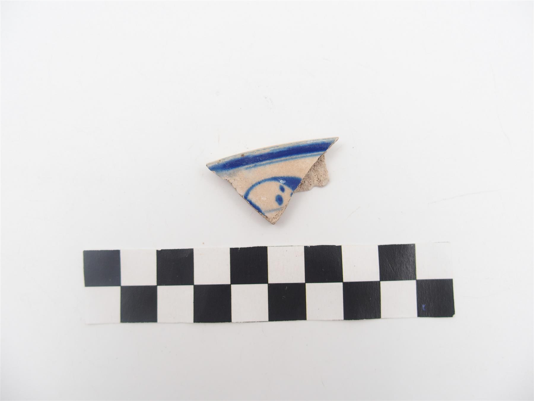 | Valkosavesta valmistettu kaakelin palanen, joka pinnoitettu lasilla ja koristeltu tummansinisellä kuvioinnilla. | |
