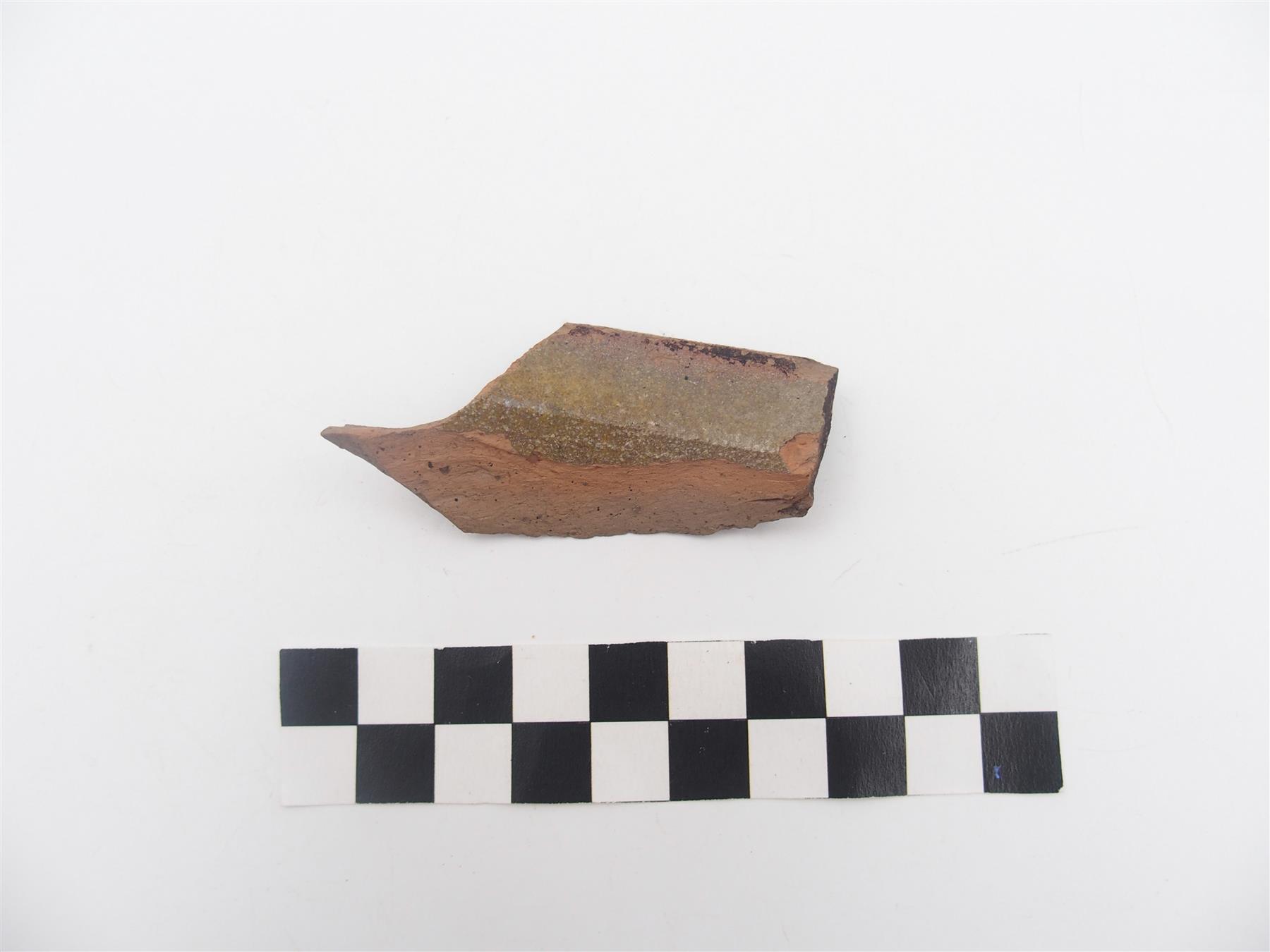 | Punasavikeraamisen kannun reunapala, joka ulospäin profiloitu. Sisäpinnalla vihreää lasitetta. Ulkopuolella lasite, mutta tämä huonosti säilynyt. Sekoitteena kivimurskaa. | |