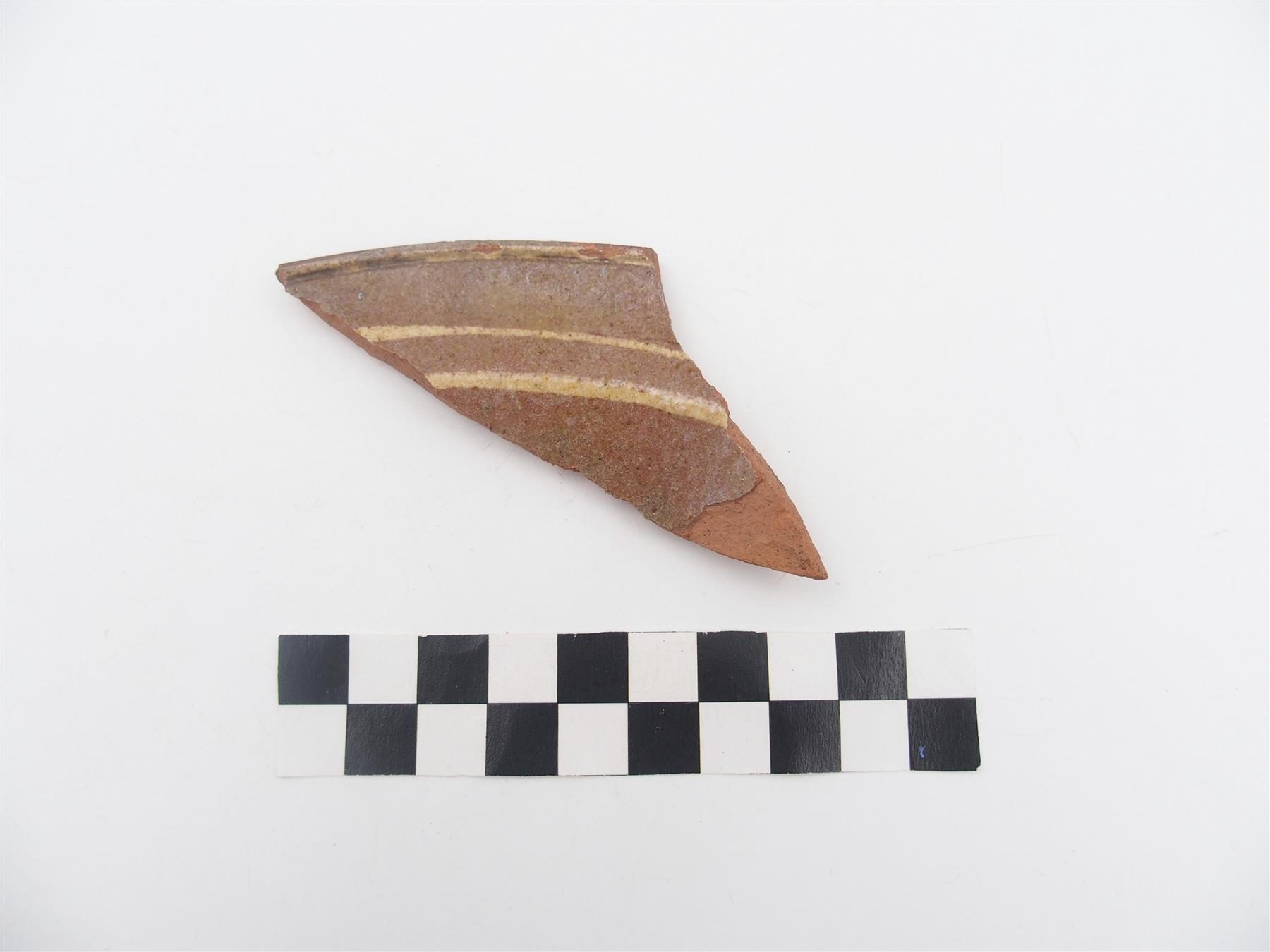 | Punasavikeraamisen astian reunapala, jossa sisäpinnalla bolus-viivakoristelua. Massan sekoitteena samottia sekä kivimurskaa. | |