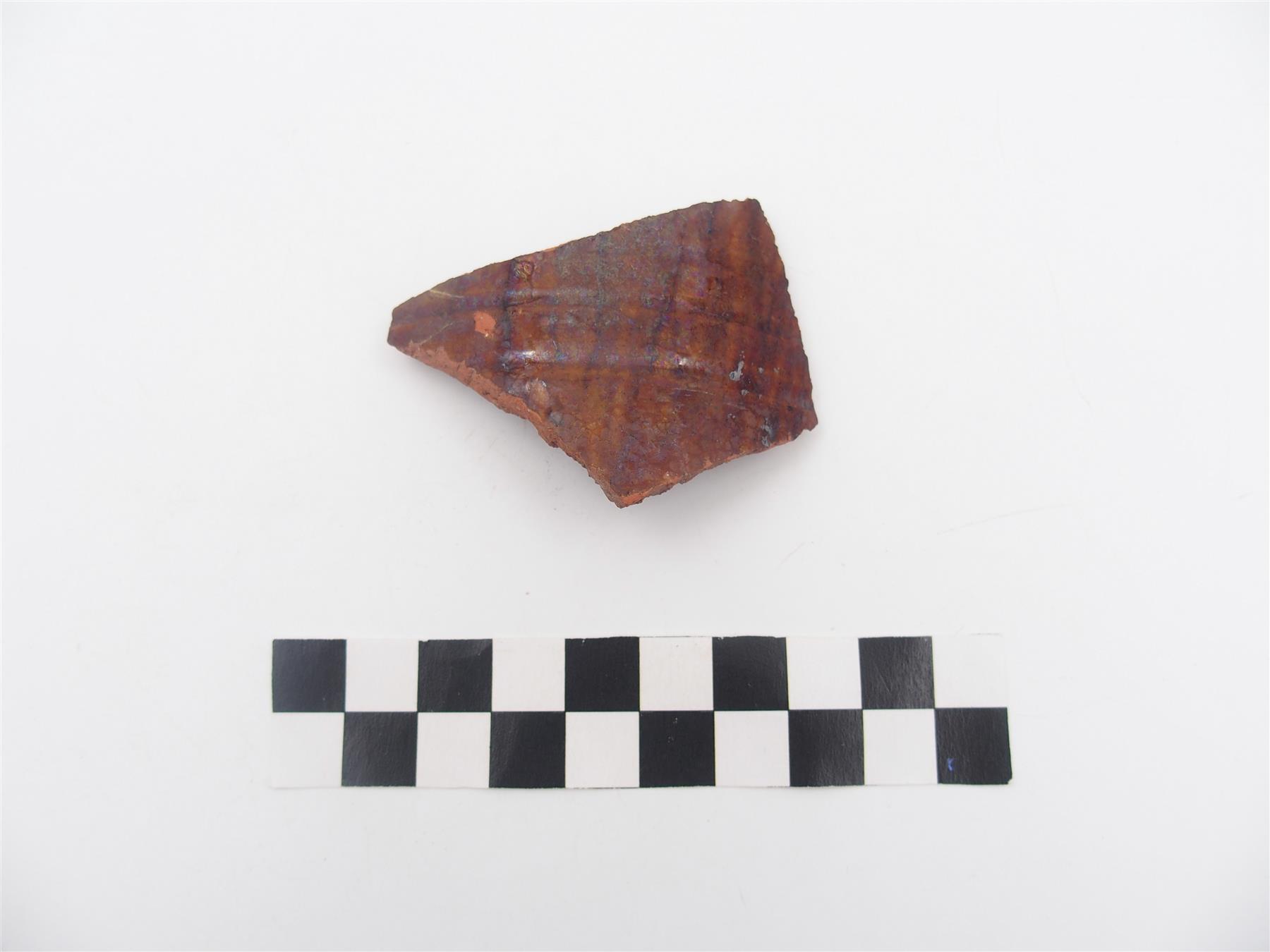 | Punasavikeraamisen astian kylkipala. Astian sisä- ja ulkopinnassa uurrekoristelua. Lasite ruskeaa. Massa huokoista. | |