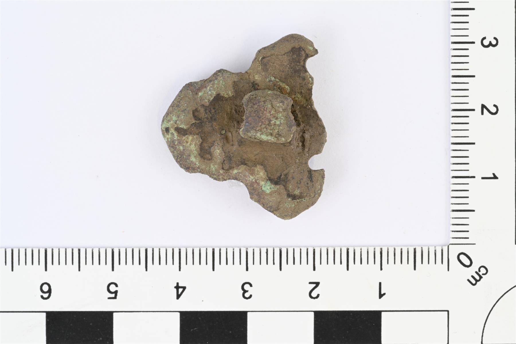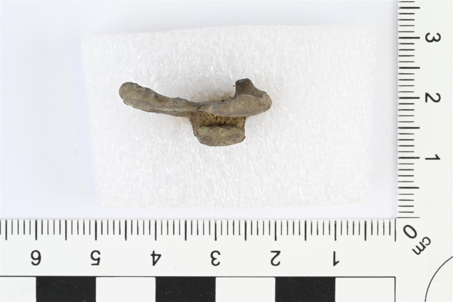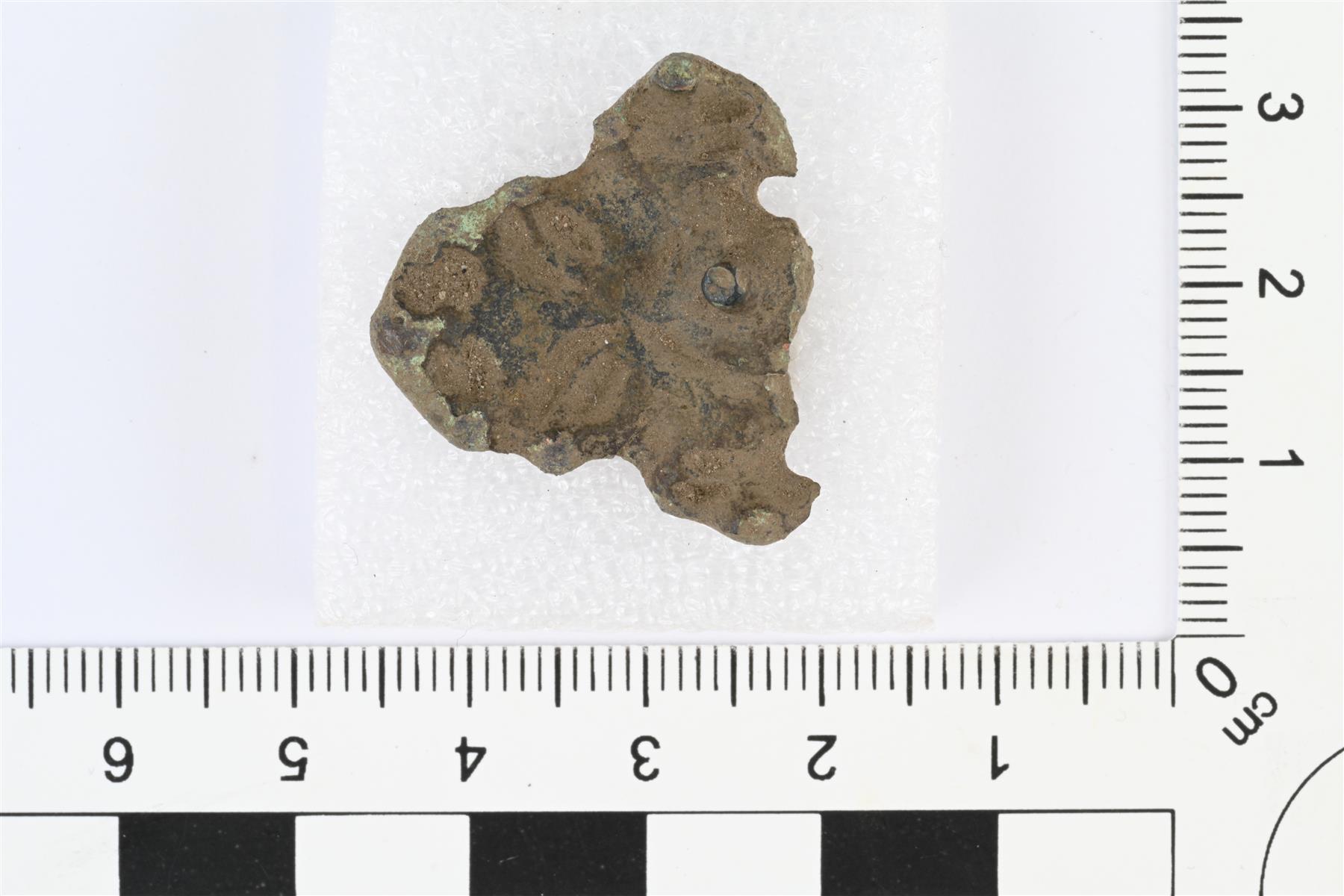 | Tasavartisen soljen päätykatkelma. Taustapuolella neulakota. Etupuolella viiva- ja kuoppakoristelua, keskellä tappi. Murtunut ilmeisesti toisessa reunassa olevan pyöreän reiän kohdalta. | |