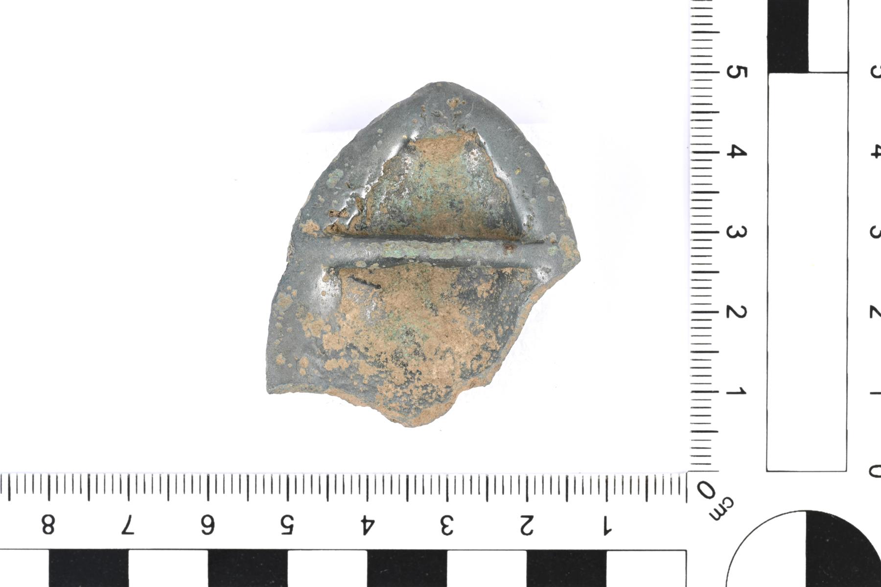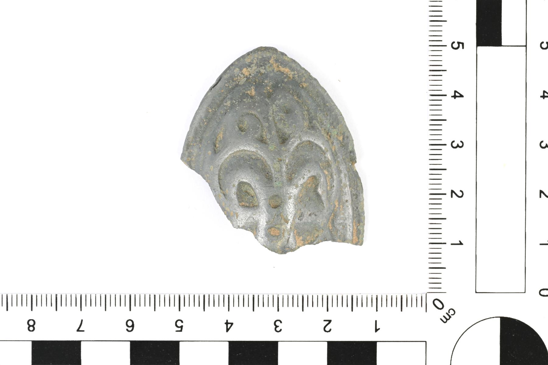 | Soikean kupurasoljen puolikas. Etupuolella on koristeluna kasviornamentiikkaa, joka muistuttaa liljakuviointia. Taustapuolella on neulan kiinnitystä varten poikittain varsi. Keskellä ollut tukivarsi on hajonnut (vrt. Ailio d2). Vastaa Ailion liljasolkia, eli G-ryhmän solkia. | |