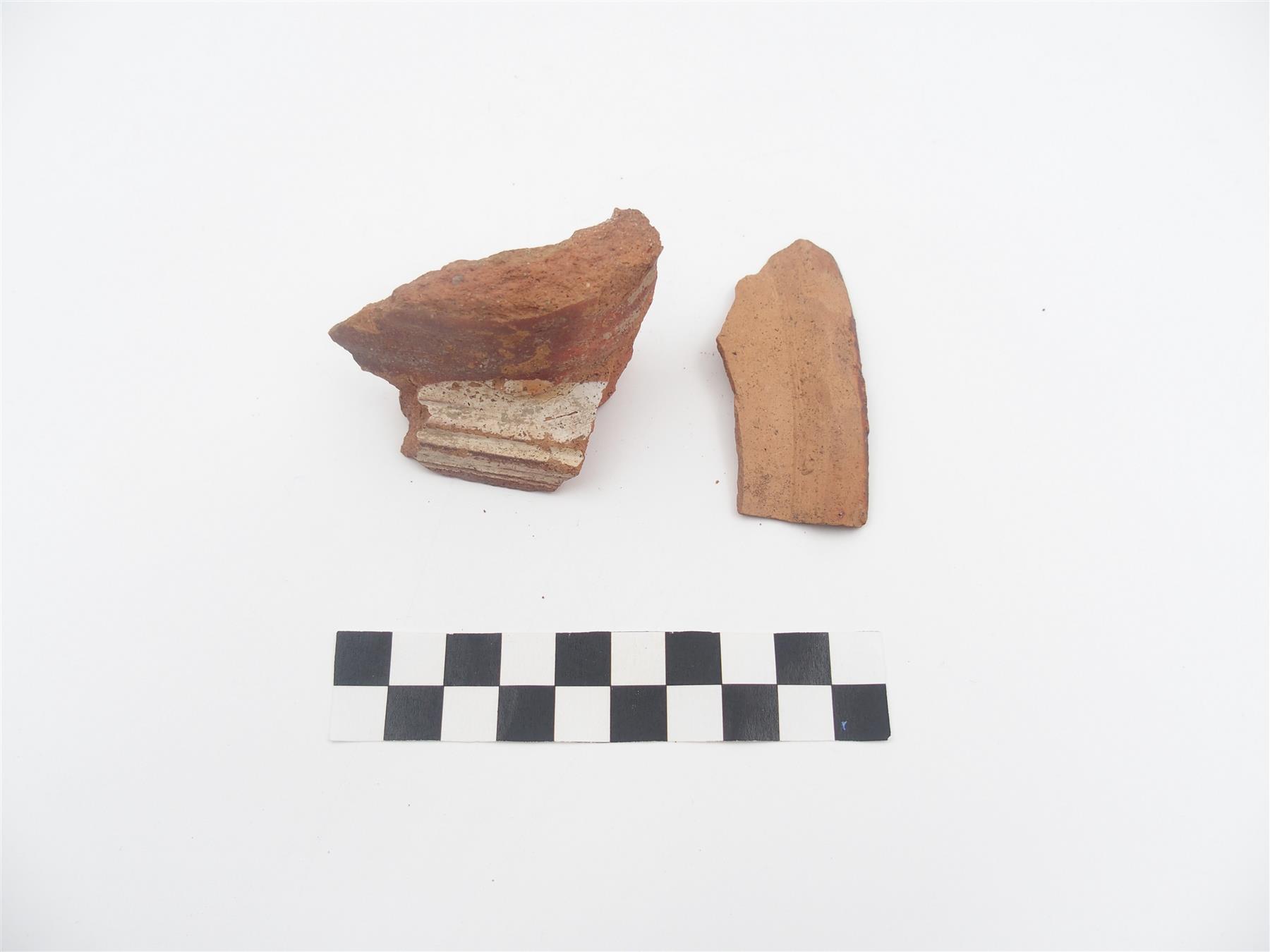 | Punasavikeraamisen astian reunapalat. Ulkopinnalla valkosavilietekoristelua. | |