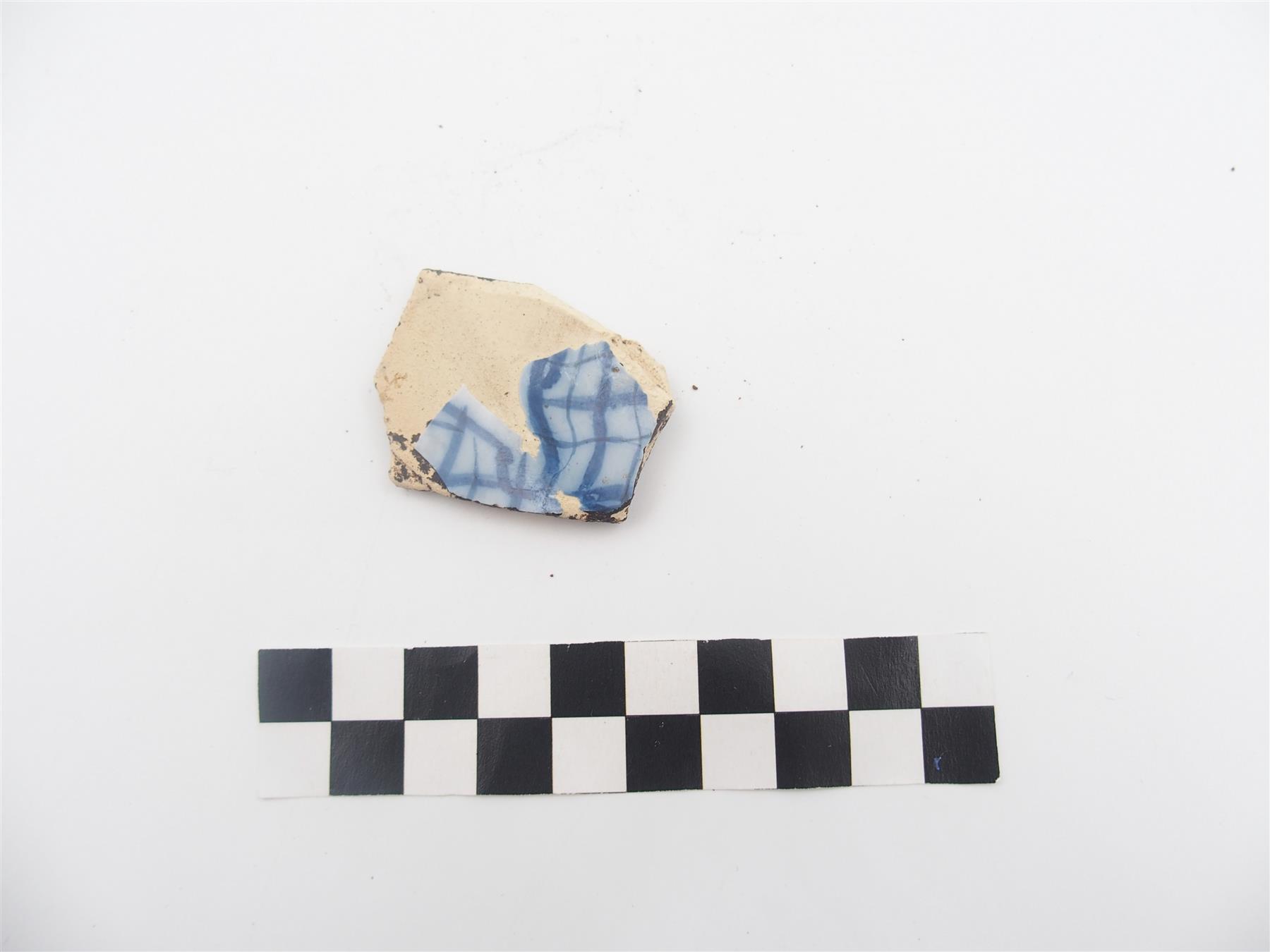 | Valkosavikeramiikka-astian kylkipala. Pinnalla lasite, jossa sinistä viivakoristelua. | |