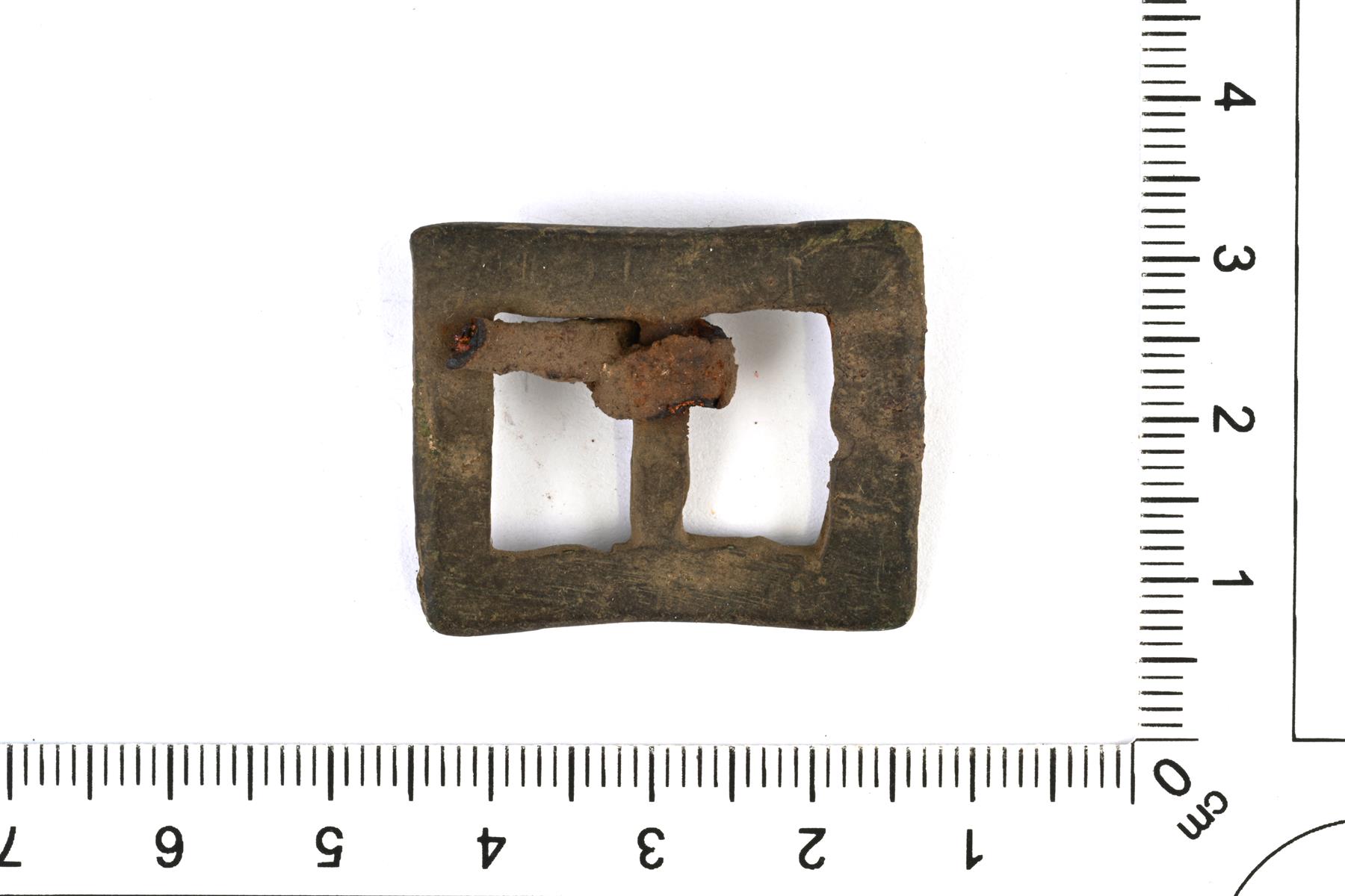 | Suorakaiteenmuotoinen vyönsolki. Keskellä on neulan kiinnitystä varten varsi. Neula on rautaa. | |