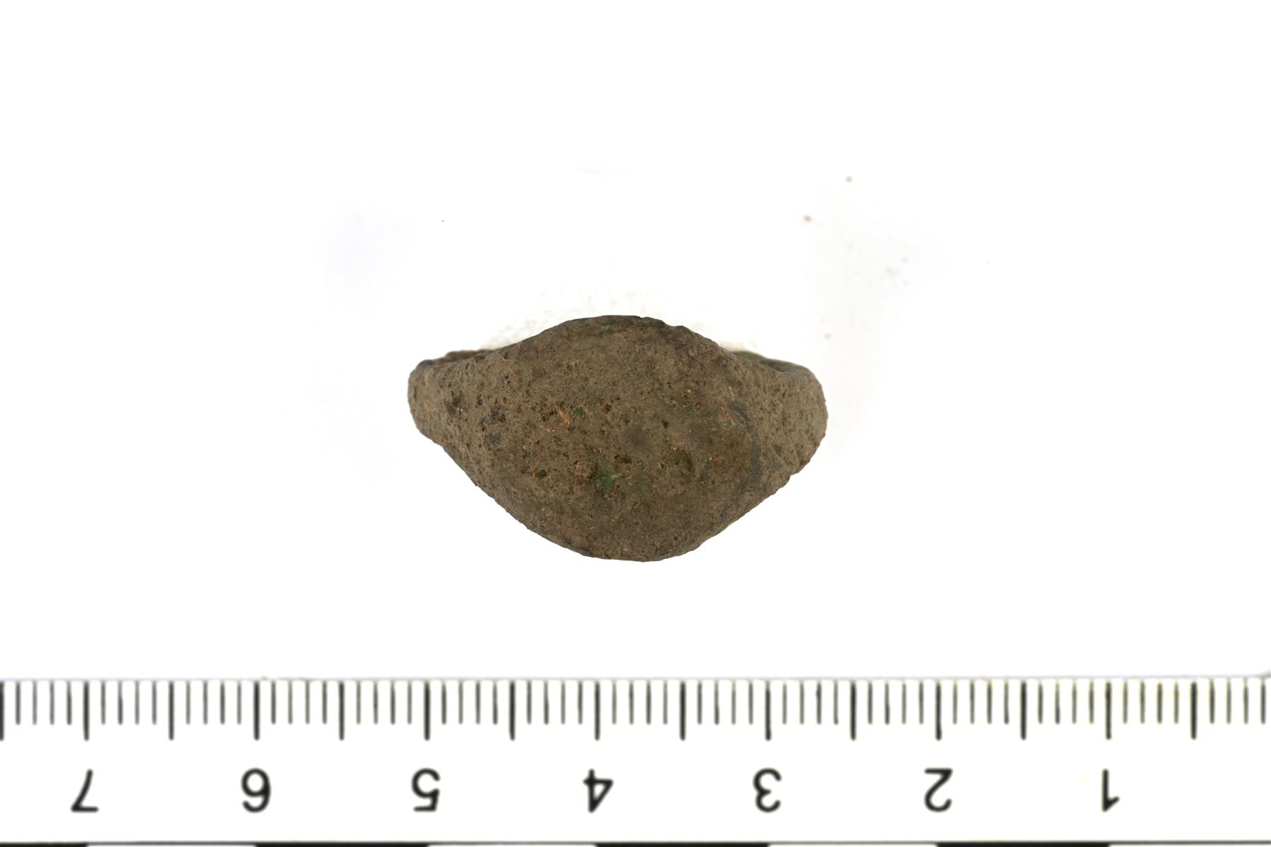 | Sarvas-sormus. Kanta on muodoltaan ovaali. Koristelu erottuu huonosti, sivuilla on uurteita. | |