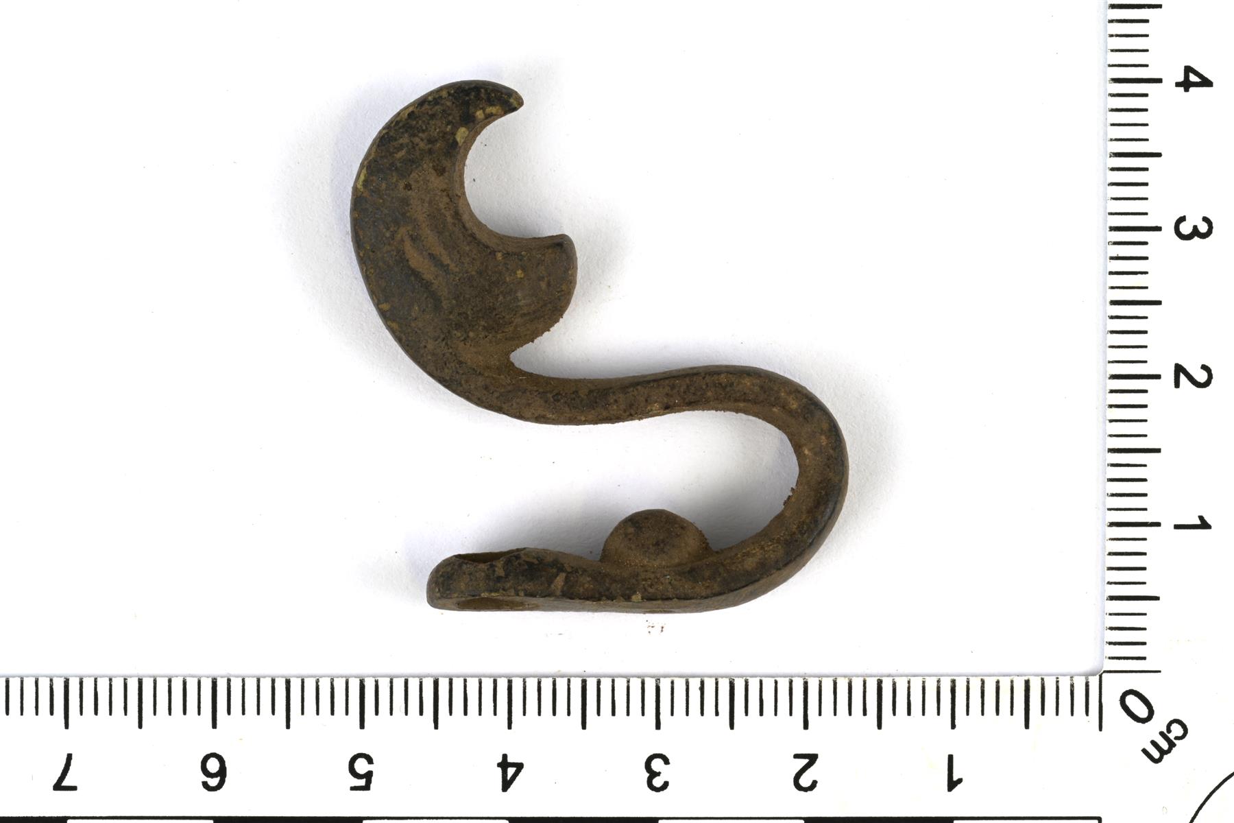 Huonekalun koristehela. Kannassa on reikä niittiä varten. Varren päässä on kuunsirpin muotoinen koriste. | |