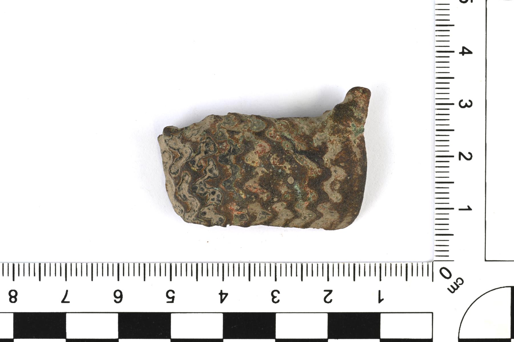 | Osittain sulanut massiivisen rannerenkaan päätykatkelma. Etupuoli on kupera ja taustapuoli suora. Koristeltu D:n muotoisten leimojen muodostamilla aaltokuvioilla. Leimojen sisällä on kolme kohopistettä. Ks. Kivikoski Abb.734. | |