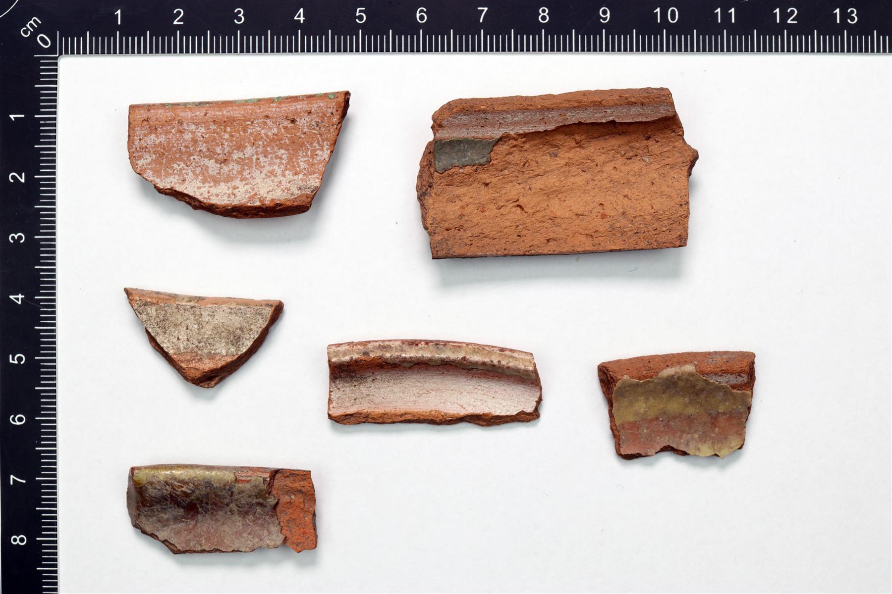 | Astian reunapaloja, joiden sisäpinnalla on valkoinen saviliete ja vihreäsävyinen lyijylasite. | |