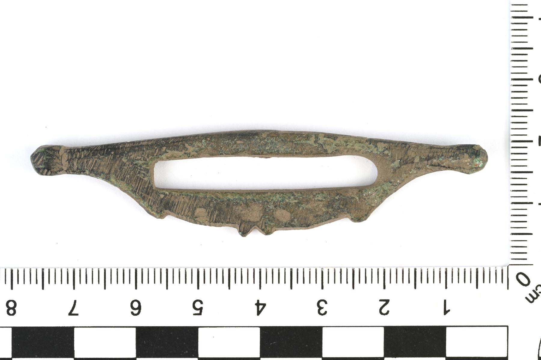 | Pitkänomainen kupariseosesine. Keskellä on suorakaiteenmuotoinen reikä. Mahdollisesti koristehela. | |
