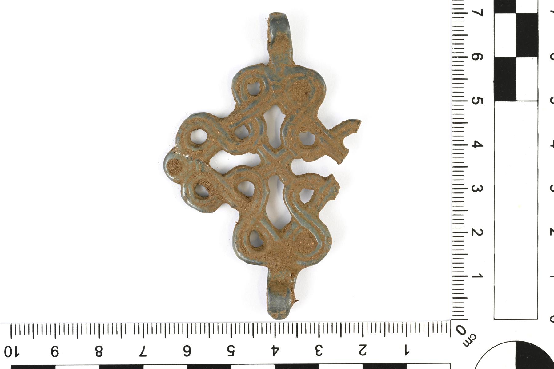 | Nauhakuvioinen ja ristinmuotoinen ketjunkantaja. Toinen sivu on hajonnut. Ylä- ja alareunassa on ripustuslenkit. Toisessa lenkissä on säilyneenä valinsauma tai valutapin jäänne. Vrt. Kivikoski Abb. 1114. | |