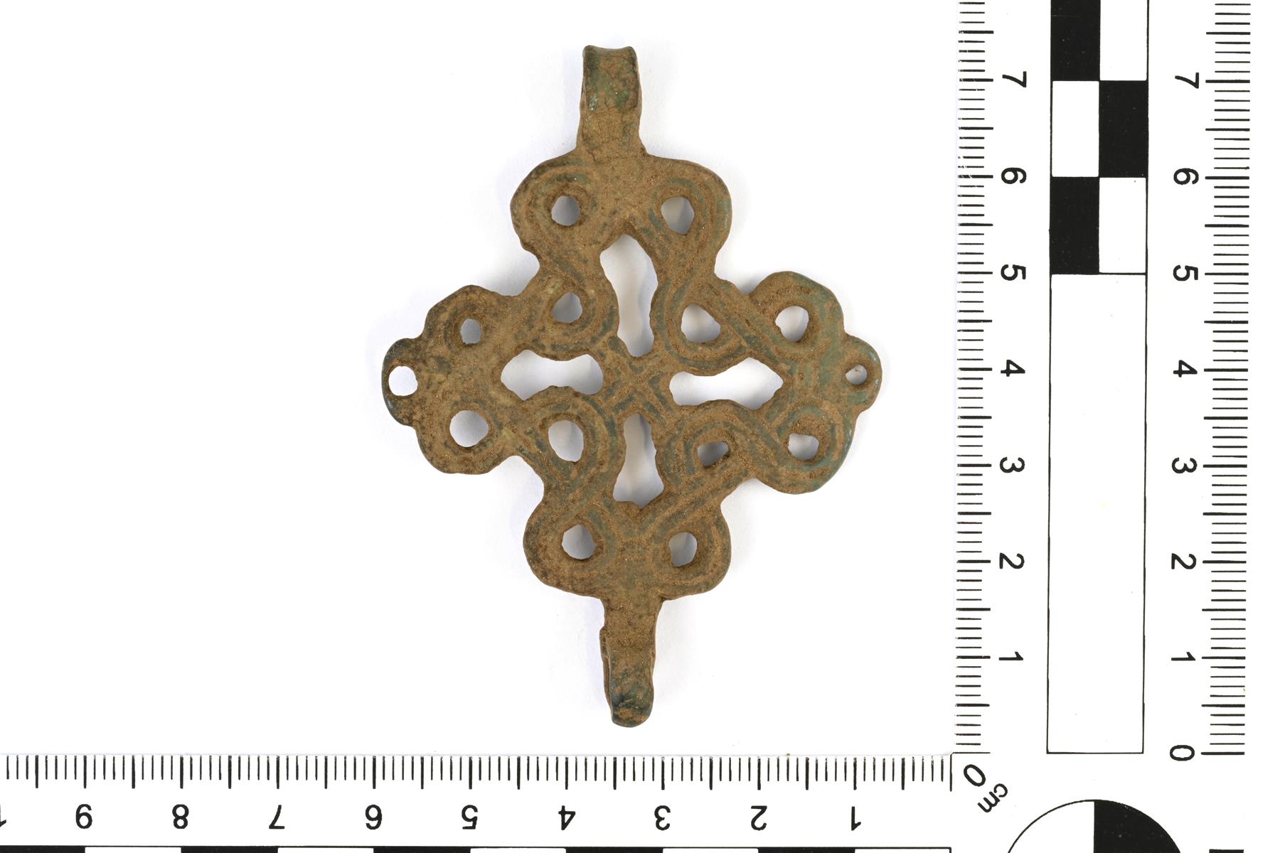 | Nauhakuvioinen ja ristinmuotoinen ketjunkantaja. Ylä- ja alareunassa on ripustuslenkit. Toisessa lenkissä on säilyneenä valinsauma tai valutapin jäänne. Samanlainen kuin: 2. Vrt. Kivikoski Abb. 1114. | |