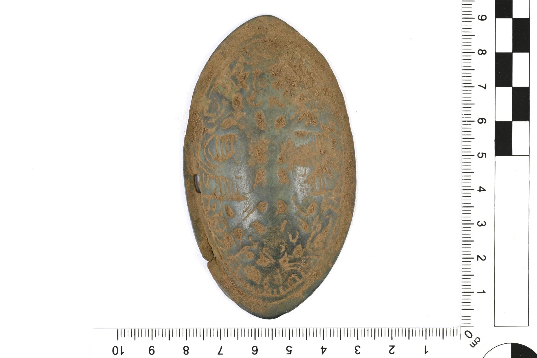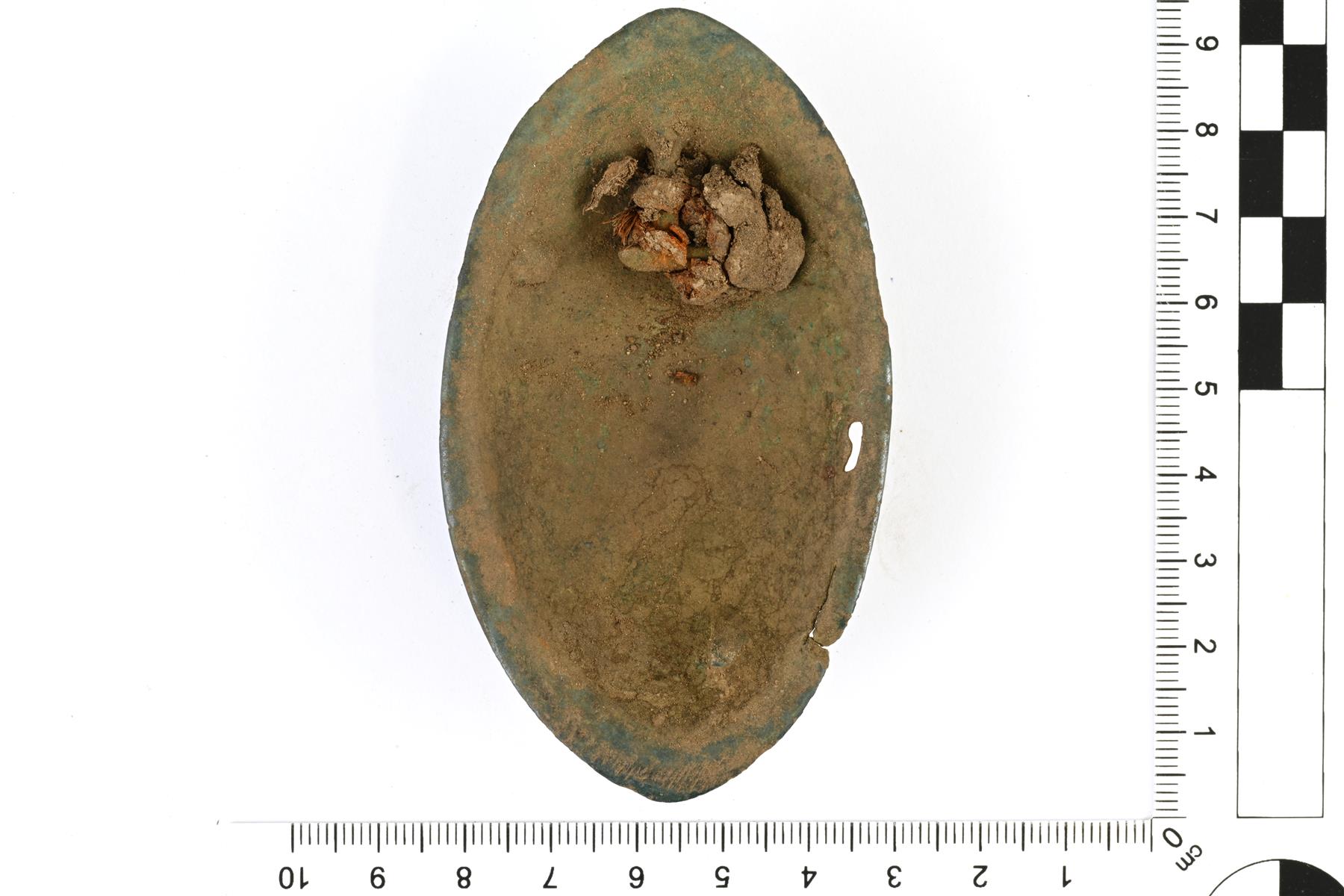 | Lähes kokonaisena säilynyt soikea kupurasolki. Kapeat päät ovat terävät. Koristeltu tyylitellyllä eläinornamentiikalla. Kyljessä on pieni reikä, joka on todennäköisesti valuvirhe. Taustapuolen neulakota on hajonnut ja neulan kiinnitysvarsi on myös epäonnistunut osittain. Poikittaisesta kiinnitysvarresta puuttuu puolet. Varren keskiosasta lähtee tukivarsi (Ailio d2). Vastaa C2-tyypin soikeita kupurasolkia. Vrt. Kivikoski Abb. 1055. | |