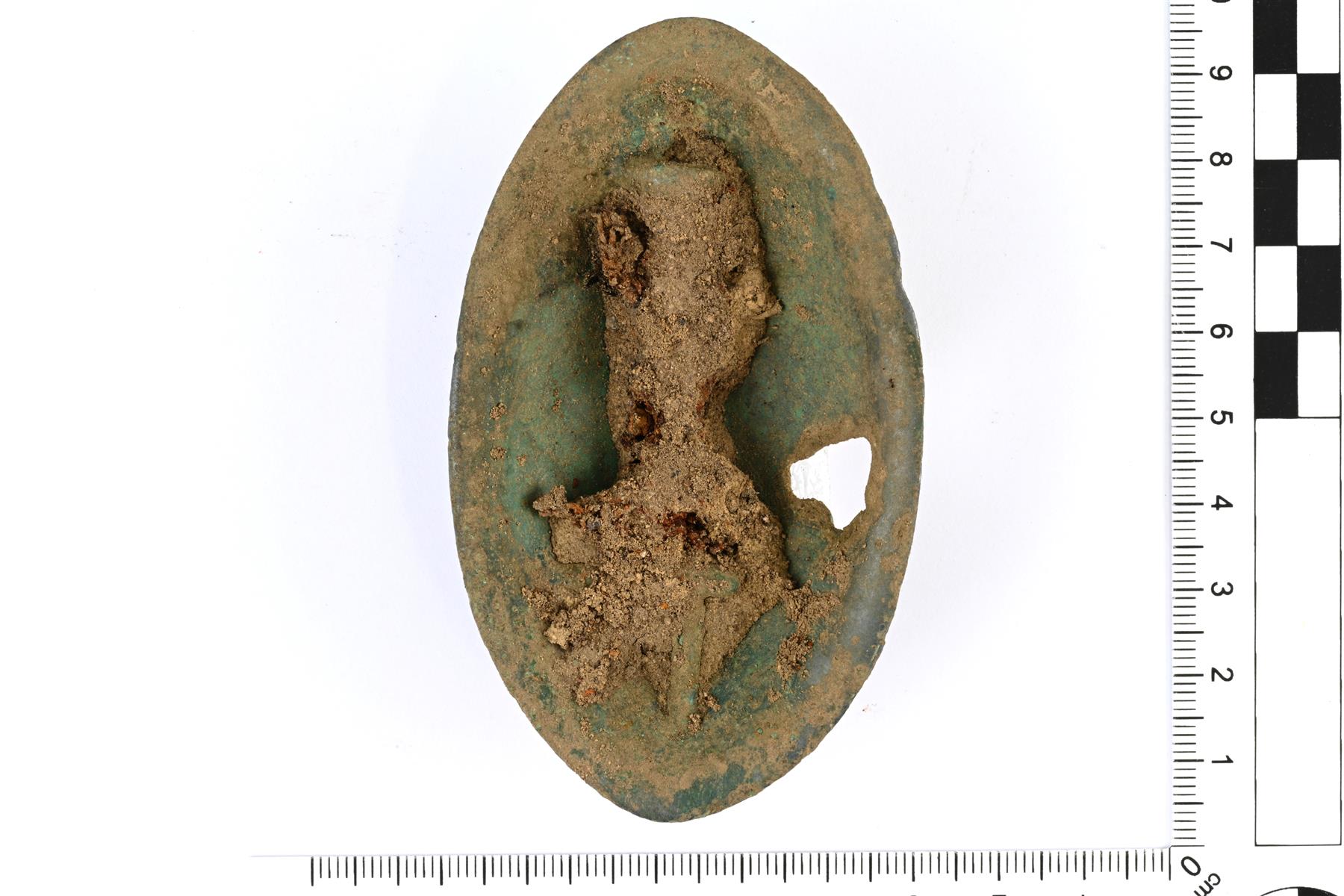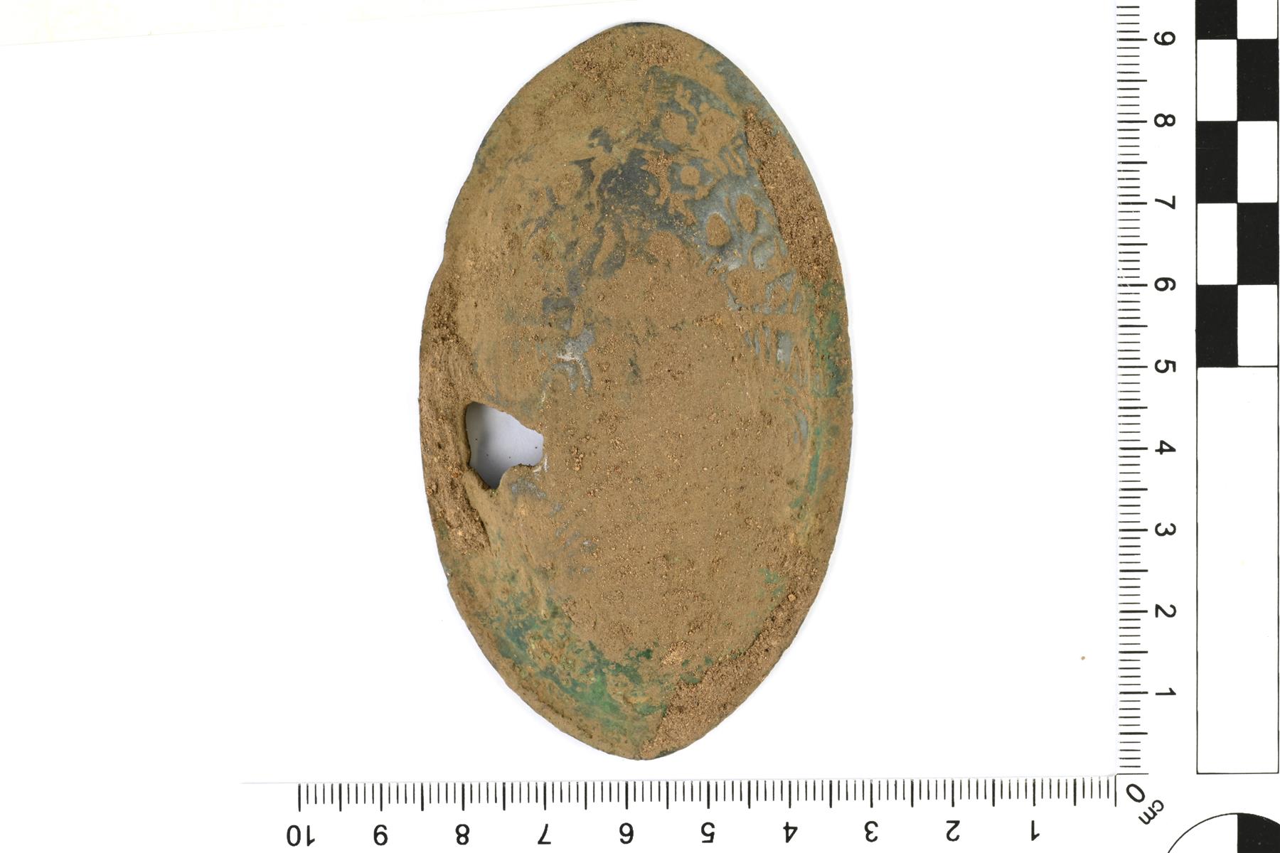 | Melko hyväkuntoinen soikea kupurasolki. Kapeat päät ovat terävät. Koristeltu tyylitellyllä eläinornamentiikalla. Kyljessä on reikä, joka on syntynyt valuvirheenä. Neulan kiinnitysvarsi on myös osittain epäonnistunut ja siitä on säilynyt poikittaisen varren puolikas ja tukivarsi (Ailio d2). Neulakota on ehjä ja neula on säilynyt. Vastaa C2-tyypin soikeita kupurasolkia. Vrt. Kivikoski Abb. 1055. | |