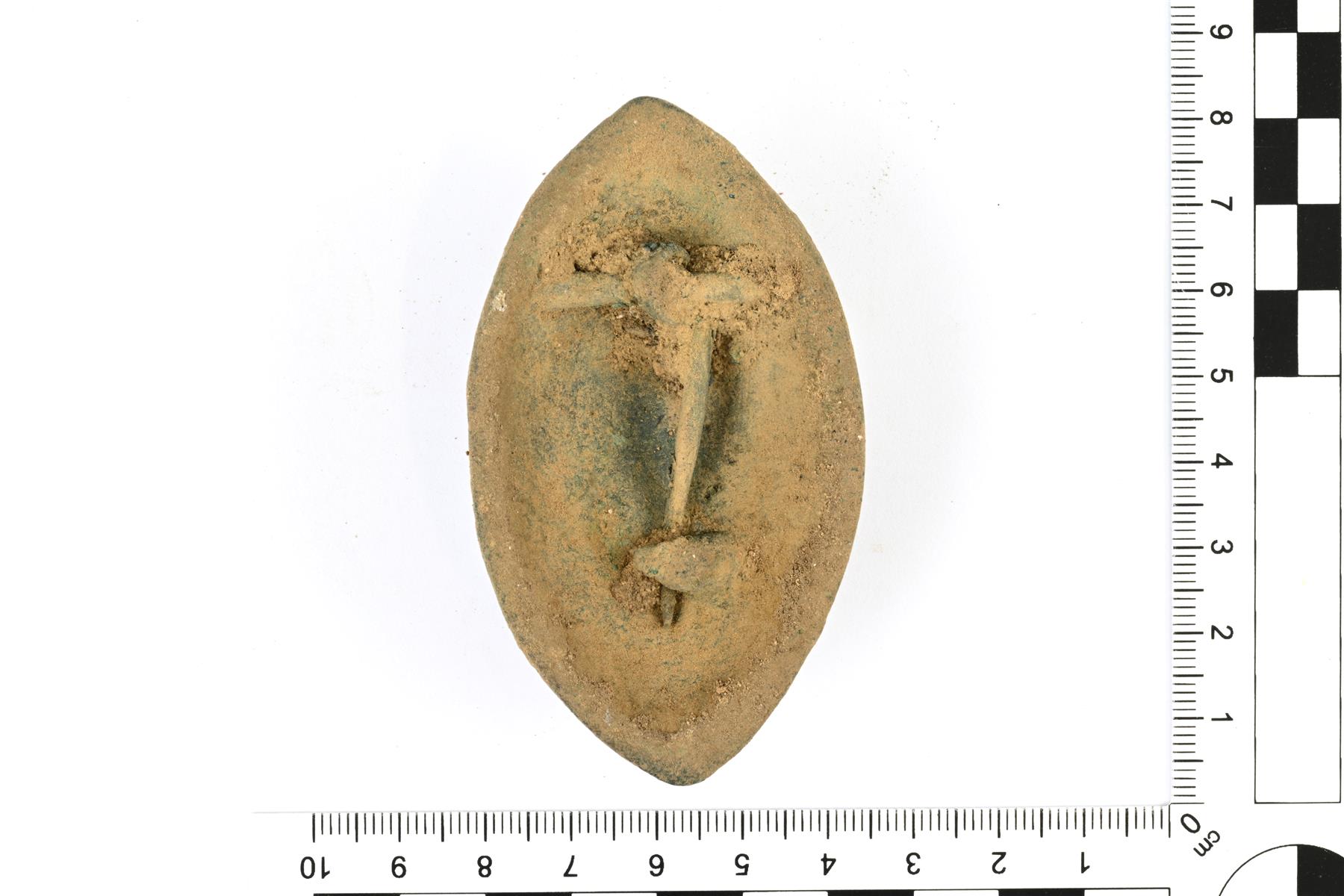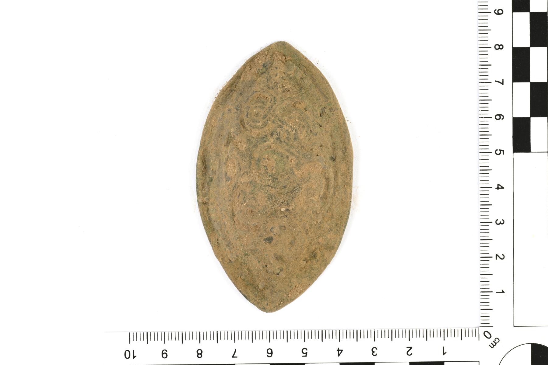 | Kokonaisena säilynyt soikea kupurasolki. Kapeat päät ovat terävät. Koristeltu nauhaornamentiikkakuvioinnilla. Taustapuolella on säilyneenä neulakota, neula sekä poikittainen neulan kiinnitysvarsi. Sivuilla on pienet kuopanteet varren liitoskohdista (Ailio c2). Vastaa F1-tyypin solkia. Vrt. Kivikoski Abb. 1058. | |