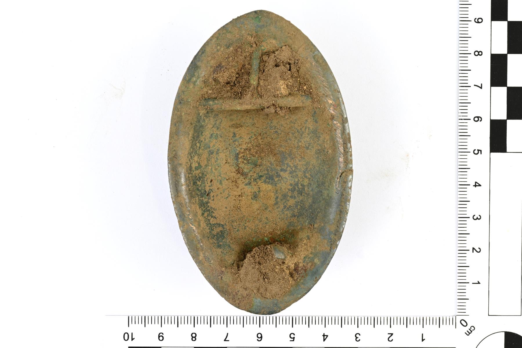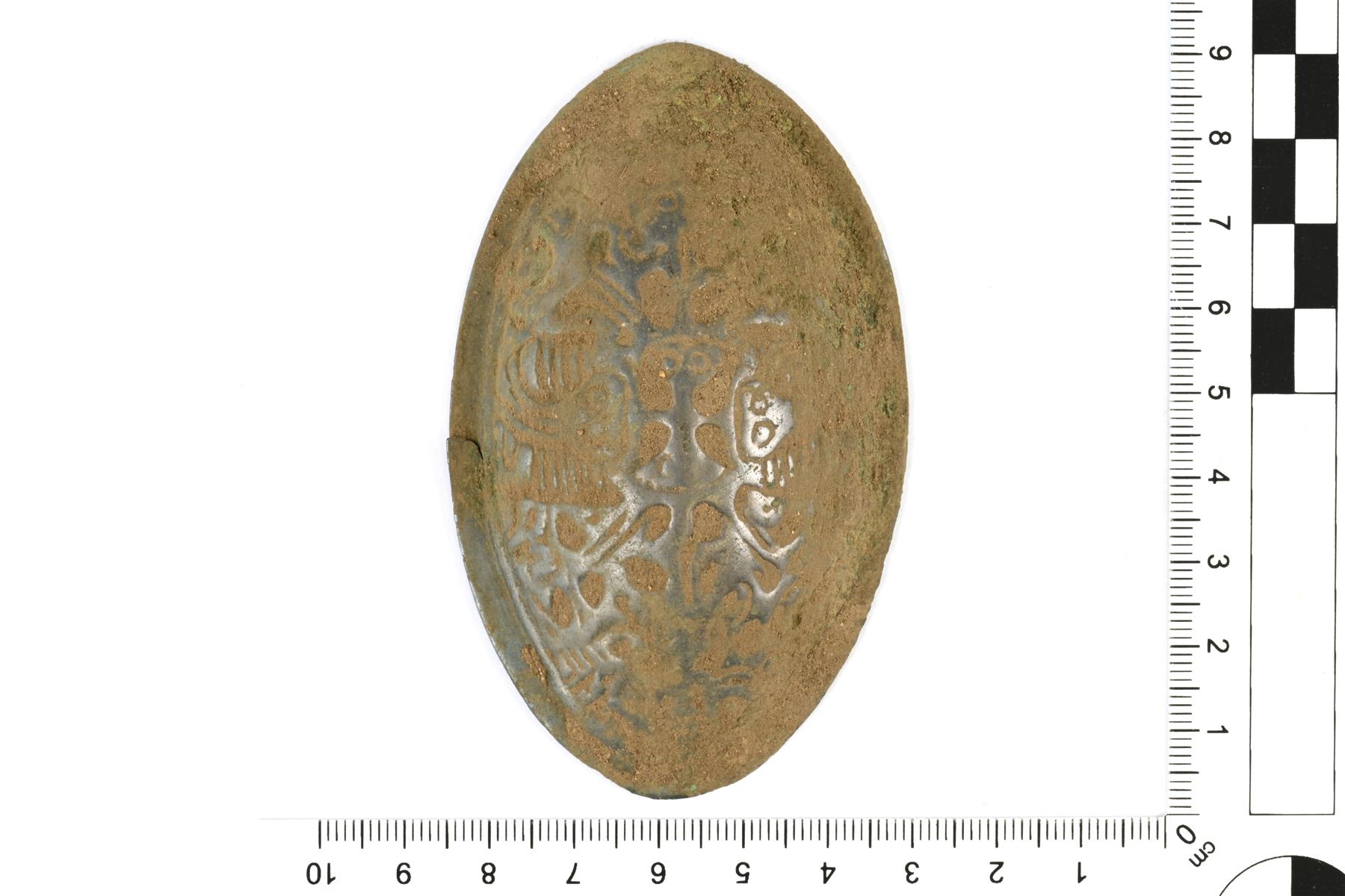 | Lähes kokonaisena säilynyt soikea kupurasolki. Kapeat päät ovat terävät. Koristeltu tyylitellyllä eläinornamentiikalla. Taustapuolen neulakota on ehjä ja neulan kiinnitysvarsi on T:n muotoinen (Ailio d2). Rautaisesta neulasta on tallella vähäisiä jäänteitä. Vastaa C2-tyypin soikeita kupurasolkia. Vrt. Kivikoski Abb. 1055. | |
