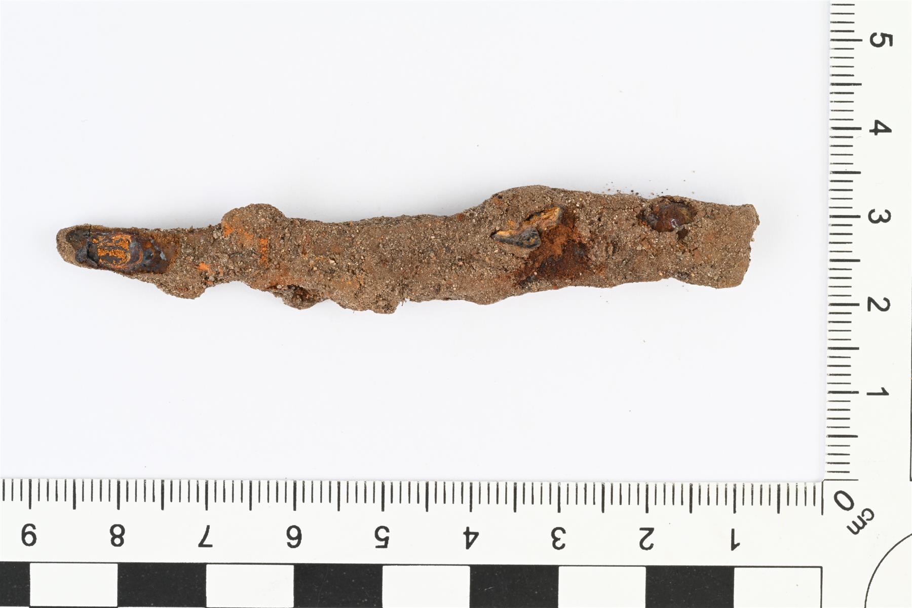 | Ruodollisen veitsenterän katkelma. Alaruotoinen, eli teränsuu kulunut ruodon alasivua ylemmäs. Ruoto ehjä, terä katkennut hyvin lyhyeksi. | |