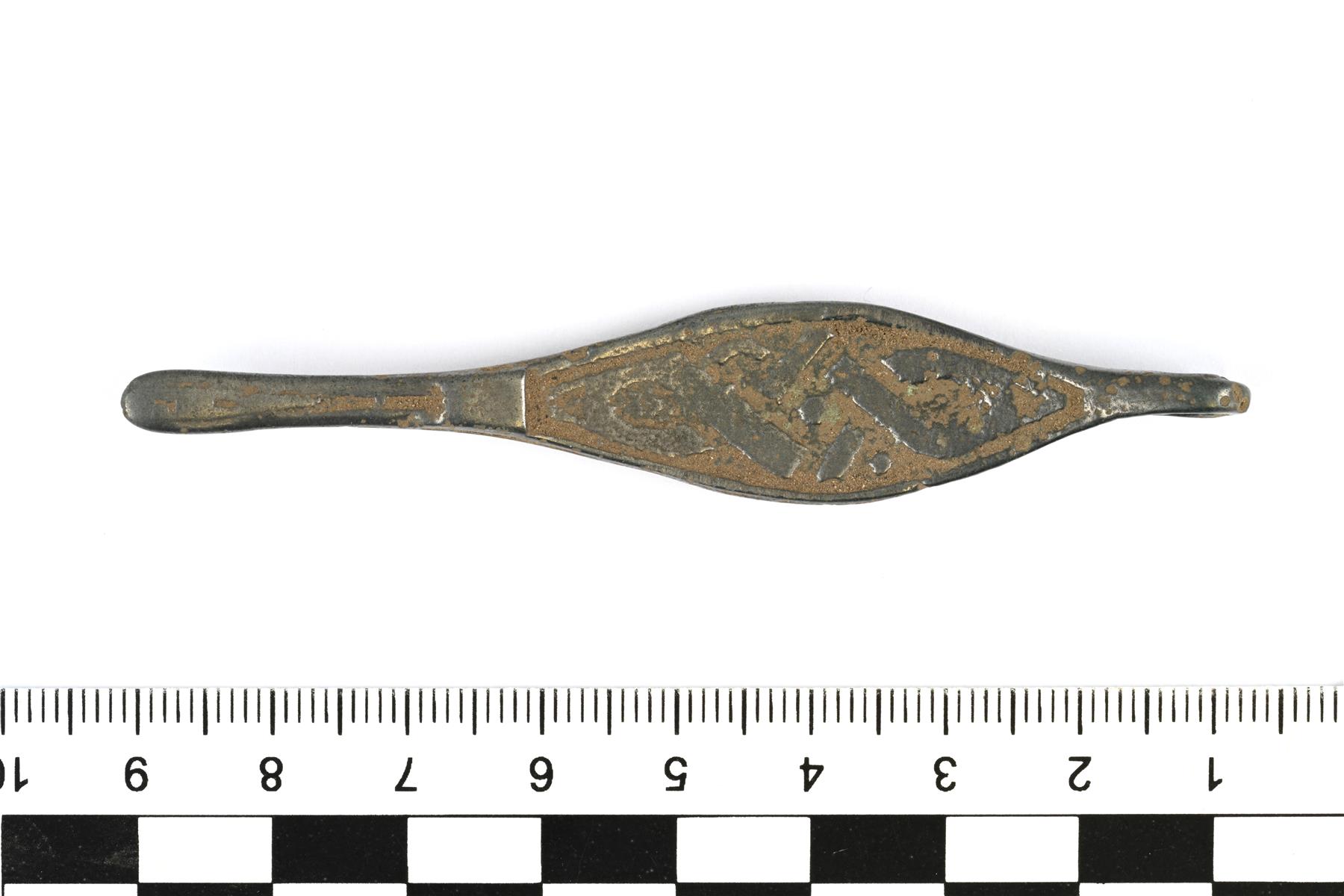 | Kokonaisena säilynyt korvalusikka. Keskiosa on ovaalinmuotoinen ja koristeltu nauhamaisella kasviornamentiikkakuviolla. Vrt. Kivikoski Abb. 1213 ja 1214. | |