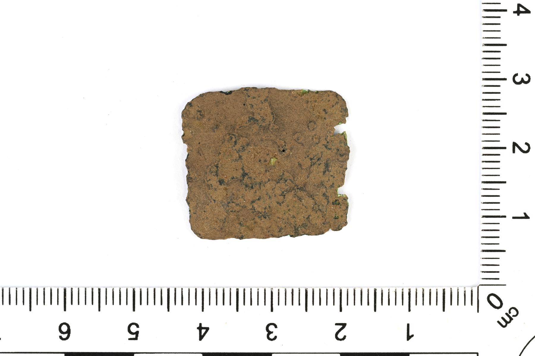 | Suorakaiteenmuotoinen levy, mahdollisesti hela. Taustapuolella on kiinnitysniitin jäänne. | |