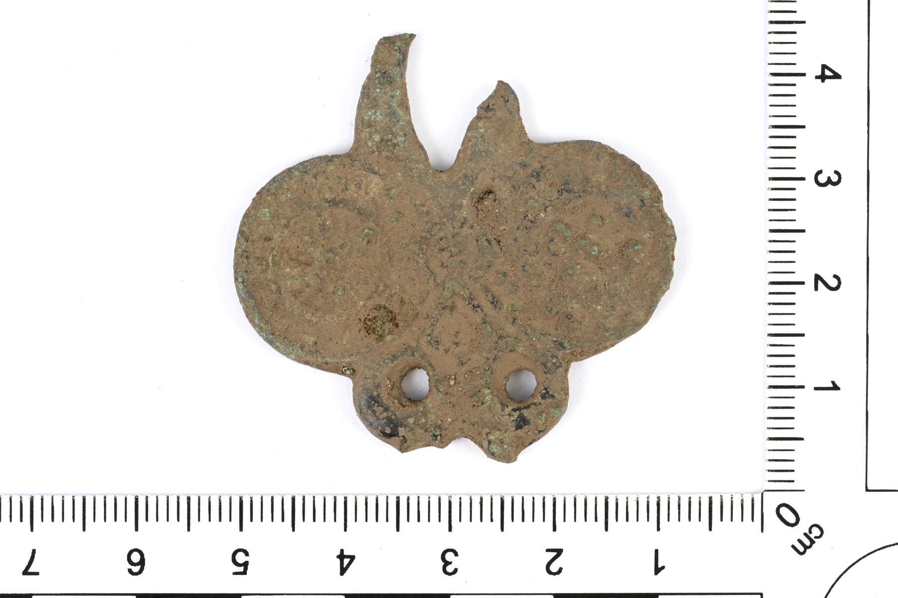 | Pyöreäkorvakkeinen ketjunkantaja. Alaosan keskimmäinen ja yläosan ripustuslenkki ovat hajonneet. Sivuilla olevissa korvakkeissa on koristeluna sisäkkäisiä kehiä. Melko huonokuntoinen. Vrt. Kivikoski Abb. 767, 768 ja 1110. | |