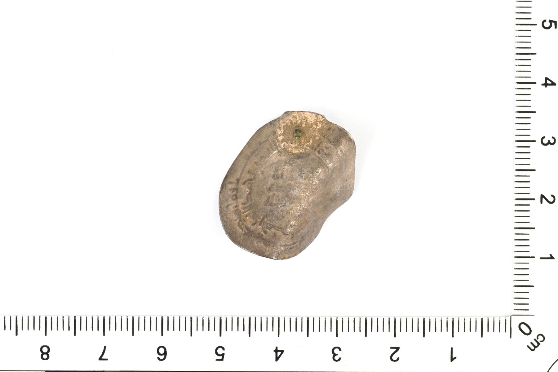 | Samanidit, Ahmad ibn Ismail, dirhemi, Samarqand AH 300 (912/913 jaa). Käytetty riipuksena, reunassa on reikä. | |