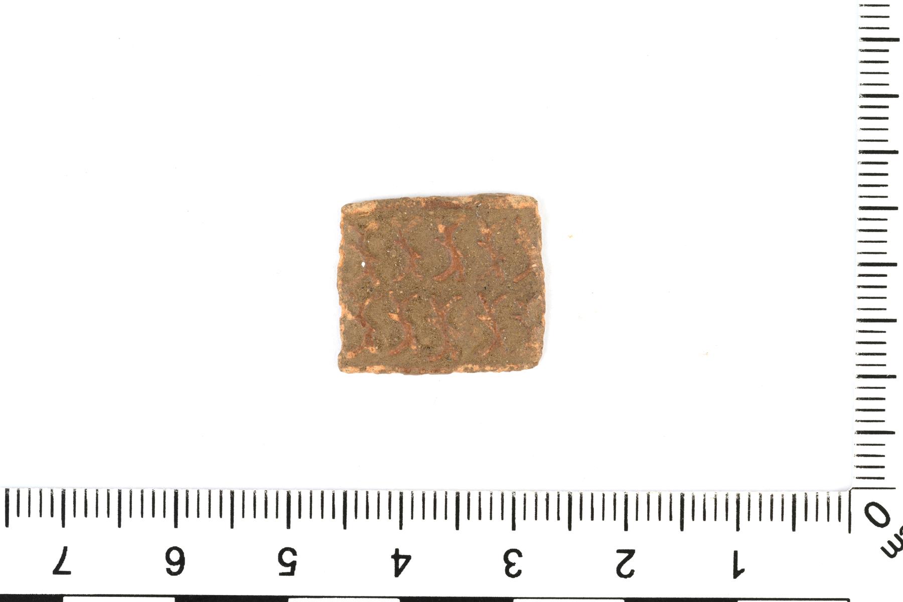| Suorakaiteenmuotoinen lyijylevyn katkelma. Etupuolella on koristeena kohokuvioisia kasviornamentiikkakuvioita. Mahdollisesti hela. | |