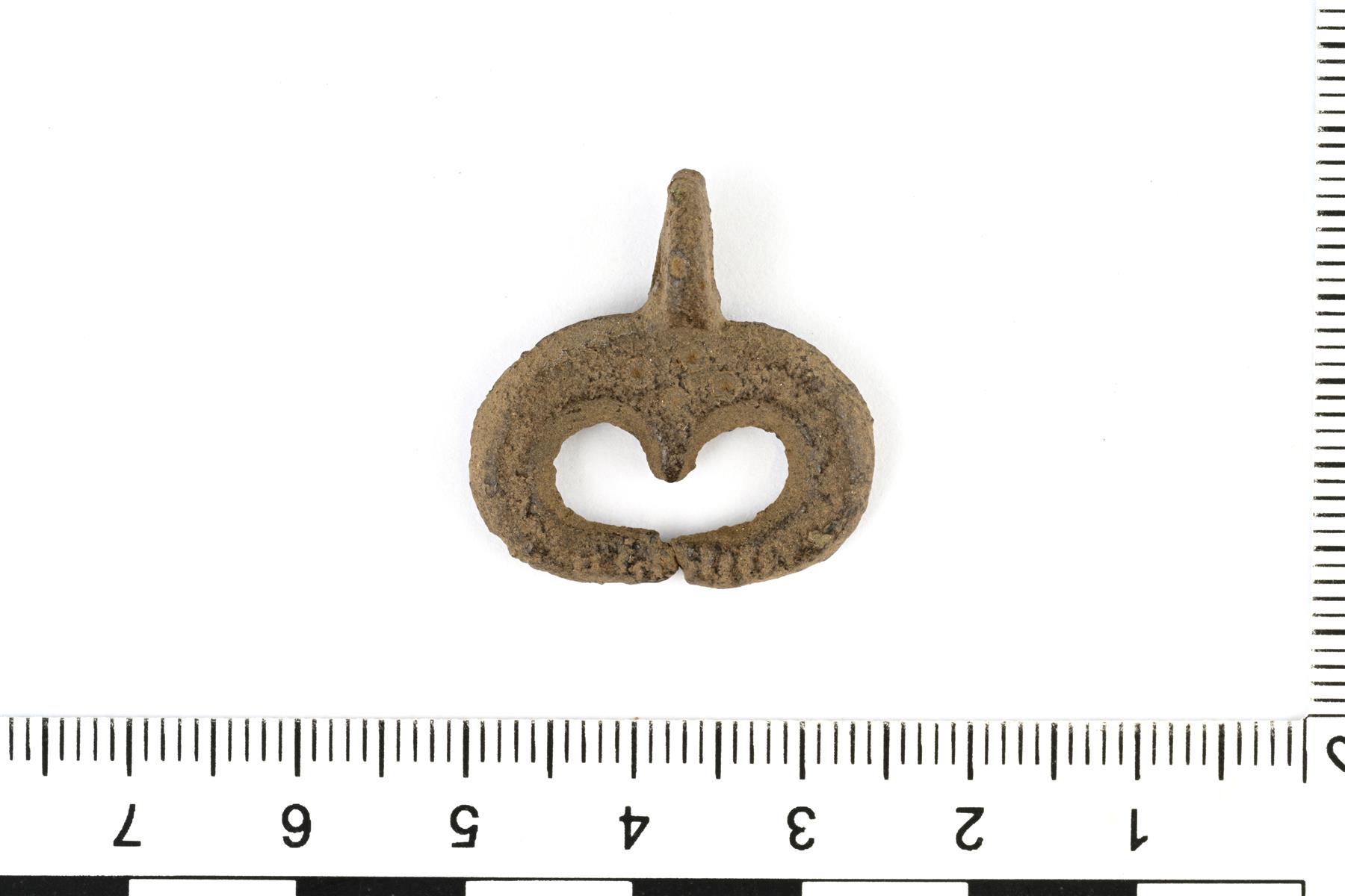 | Kokonaisena säilynyt lunulariipus. Kuunsirpin päädyt kaartuvat yhteen. Päädyissä on uurrekoristelua. Yläosan keskellä on kolmiomainen levennys, josa on koristeluna neljä häränsilmäleimaa. Vrt. Kivikoski Abb. 808. | |