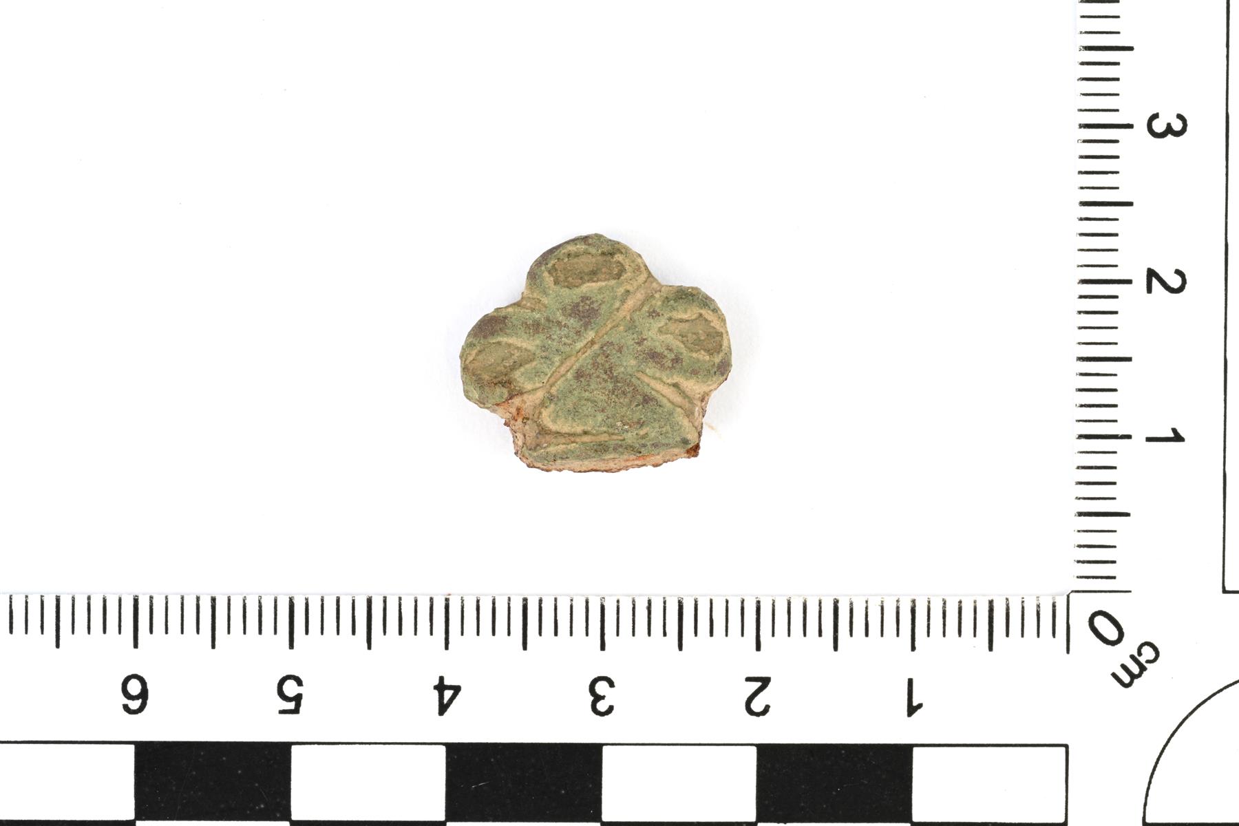 | Kolmelehdykkäinen pöytäveitsen päätehela. Kummallakin puolella on X:n muotoinen viivauurrekoriste, joka jakaa helan neljään osaan. Ruodosta on jäljellä palanen. Vrt. Holtmann Abb. 165. | |