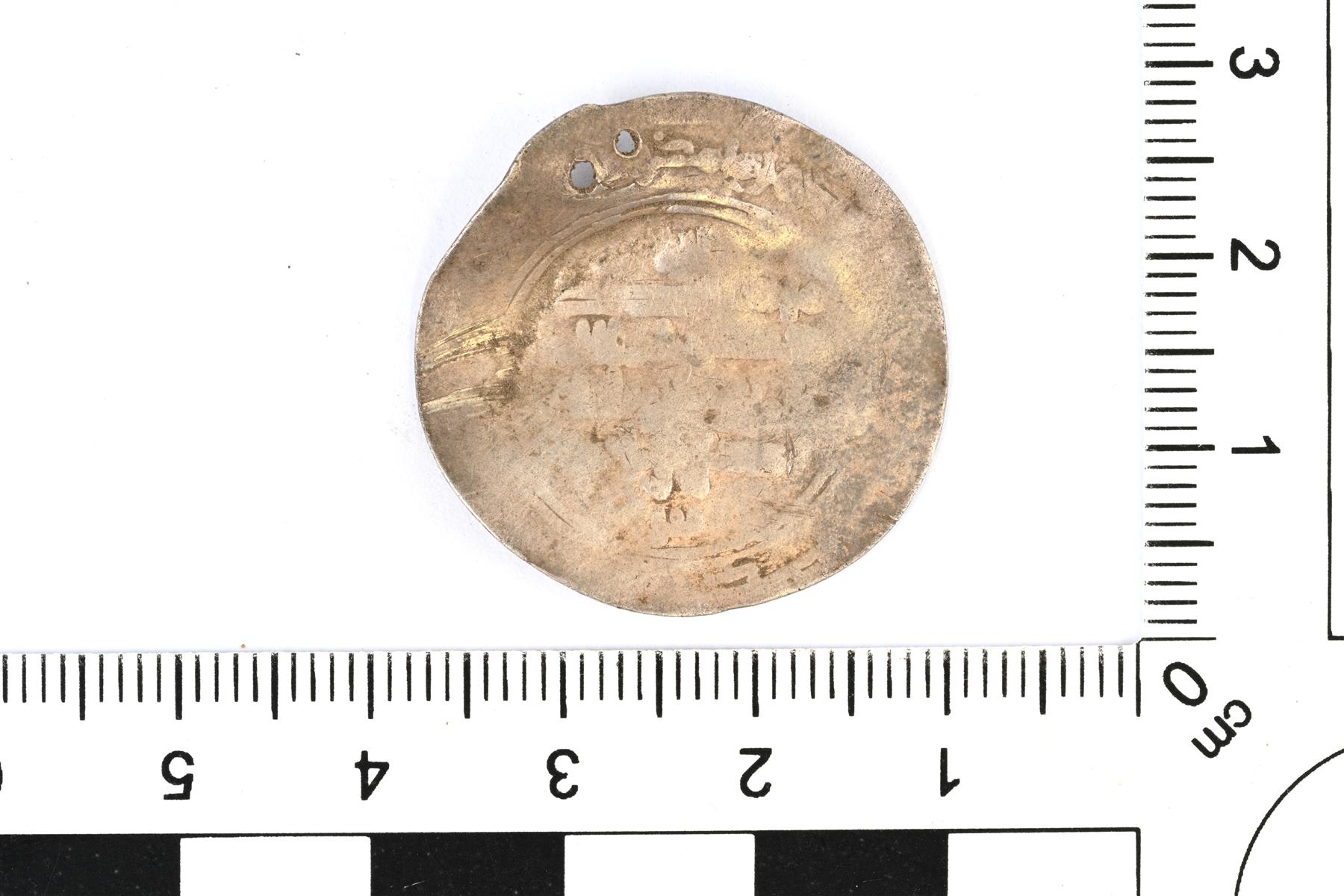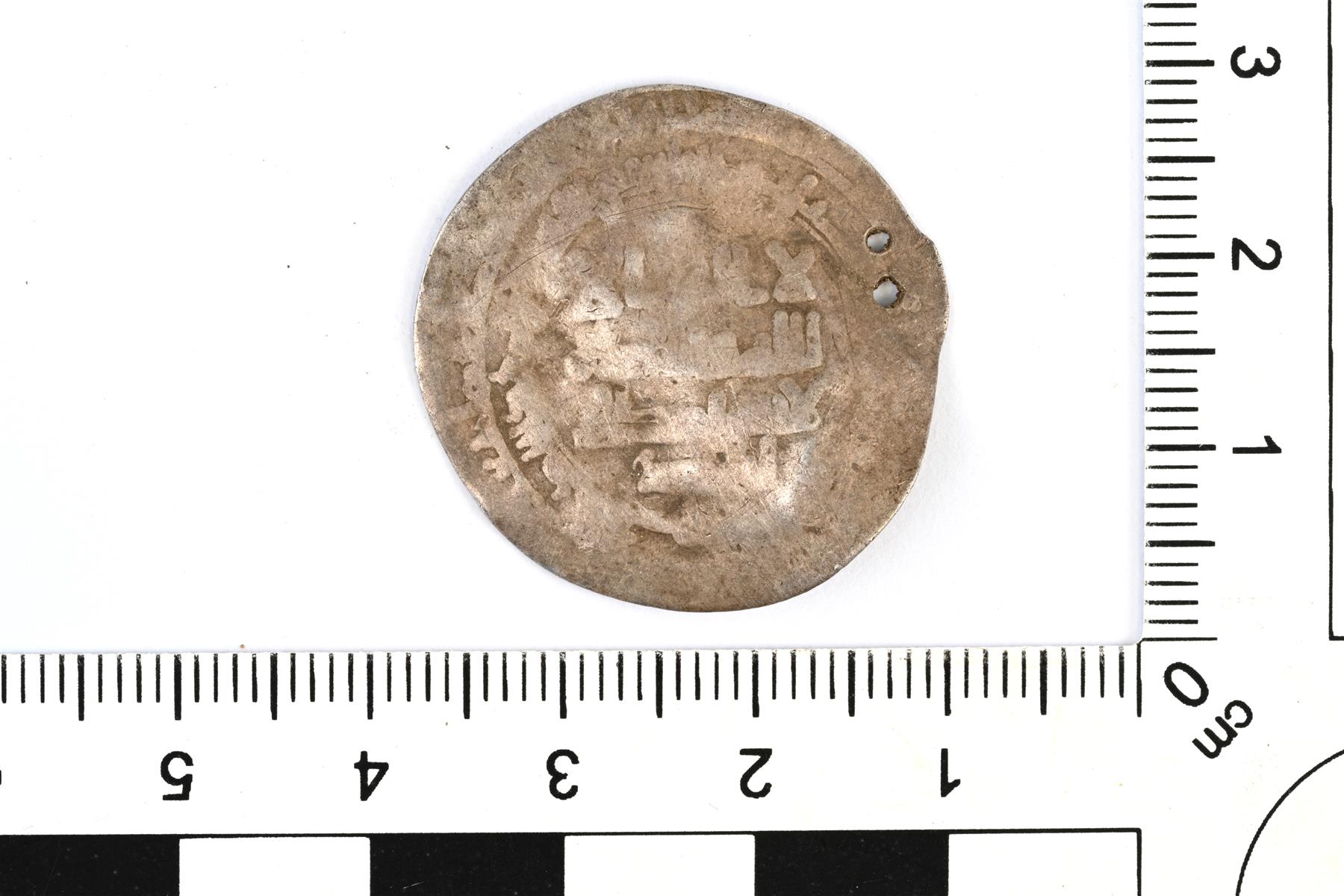 | Samanidit, Nasr ibn Ahmad, dirhemi AH 301-331, 913–942 jaa. Reunassa on kaksi pientä reikää. | |