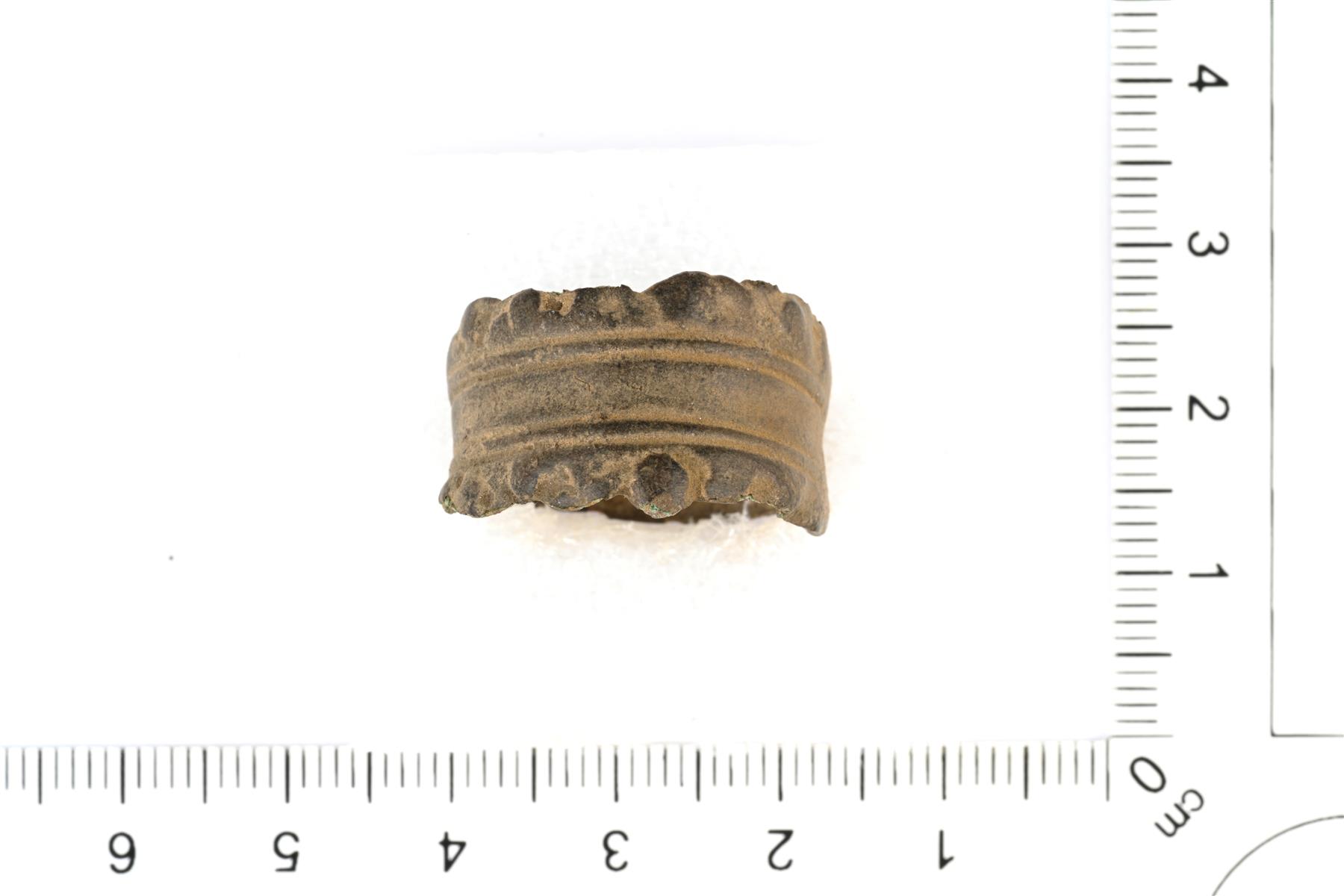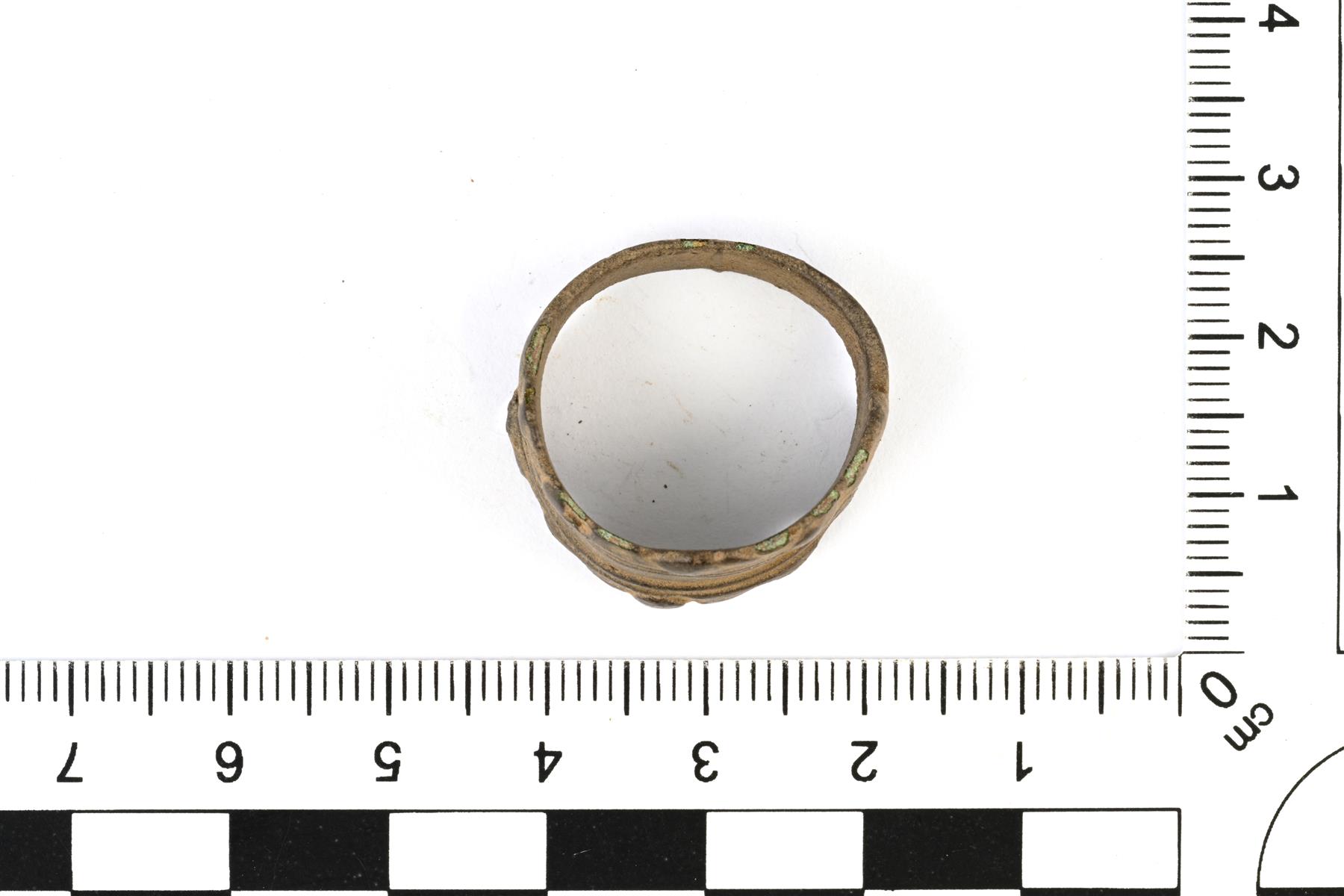 | Kokonaisena säilynyt sormus. Etuosa levenee ja sen reunat ovat aaltokuvioiset. Keskellä kulkee leveä uurre, jonka kummallakin puolella on kapeampia viivoja. | |