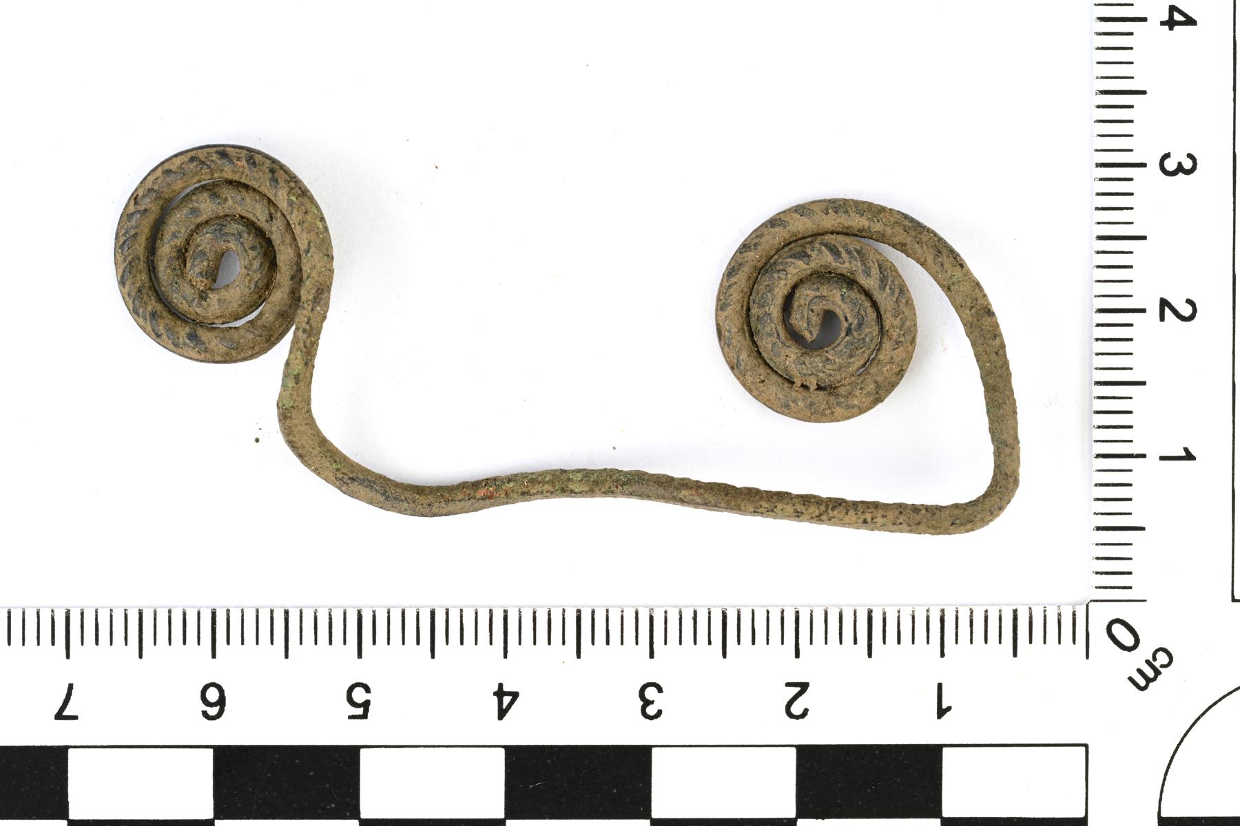 | Molemmista päistä spiraalille taivutettu kupariseoslanka. Langassa on koristeluna vinoviivakuviointia. Todennäköisimmin ketjunkantajan osa. Vrt. Kivikoski Abb. 469. | |