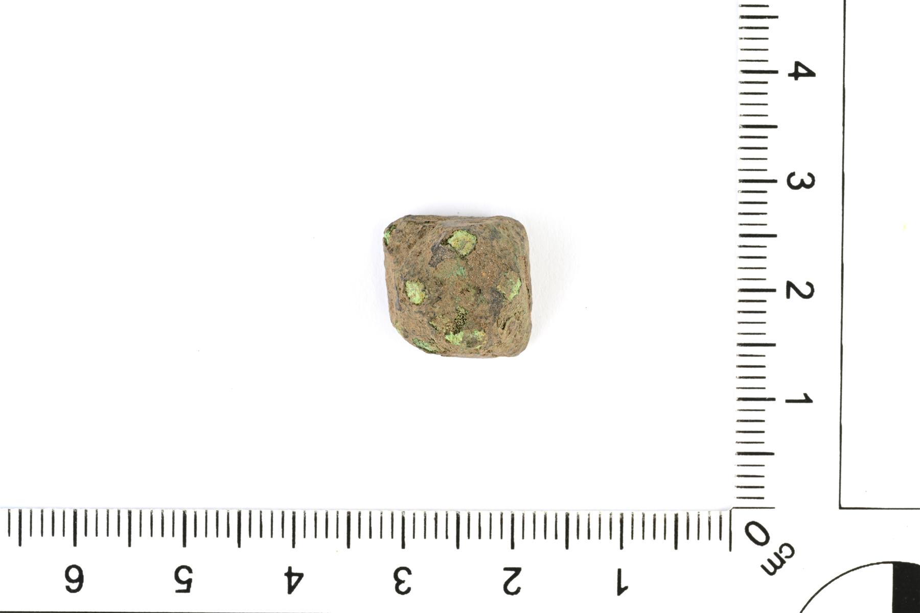 | Särmänuppisen hevosenkenkäsoljen nupin katkelma. Nuppi on muodoltaan neliömäinen ja yläkulmat on viistetty. Koristeena neljä tappia. Vrt. Kivikoski Abb. 696. | |