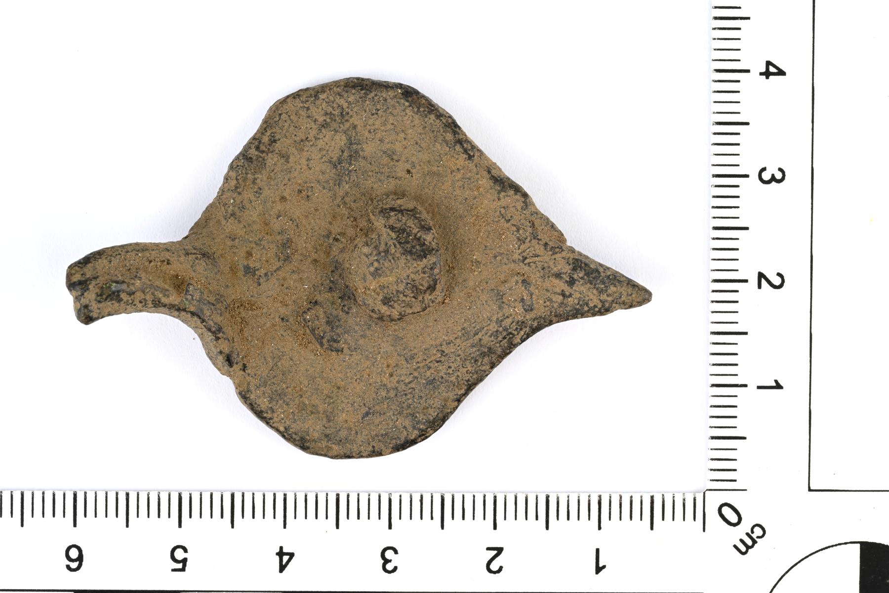 | Lehdenmuotoinen kattilankorvan katkelma. Keskellä on reikä ja niitin jäänne. | |